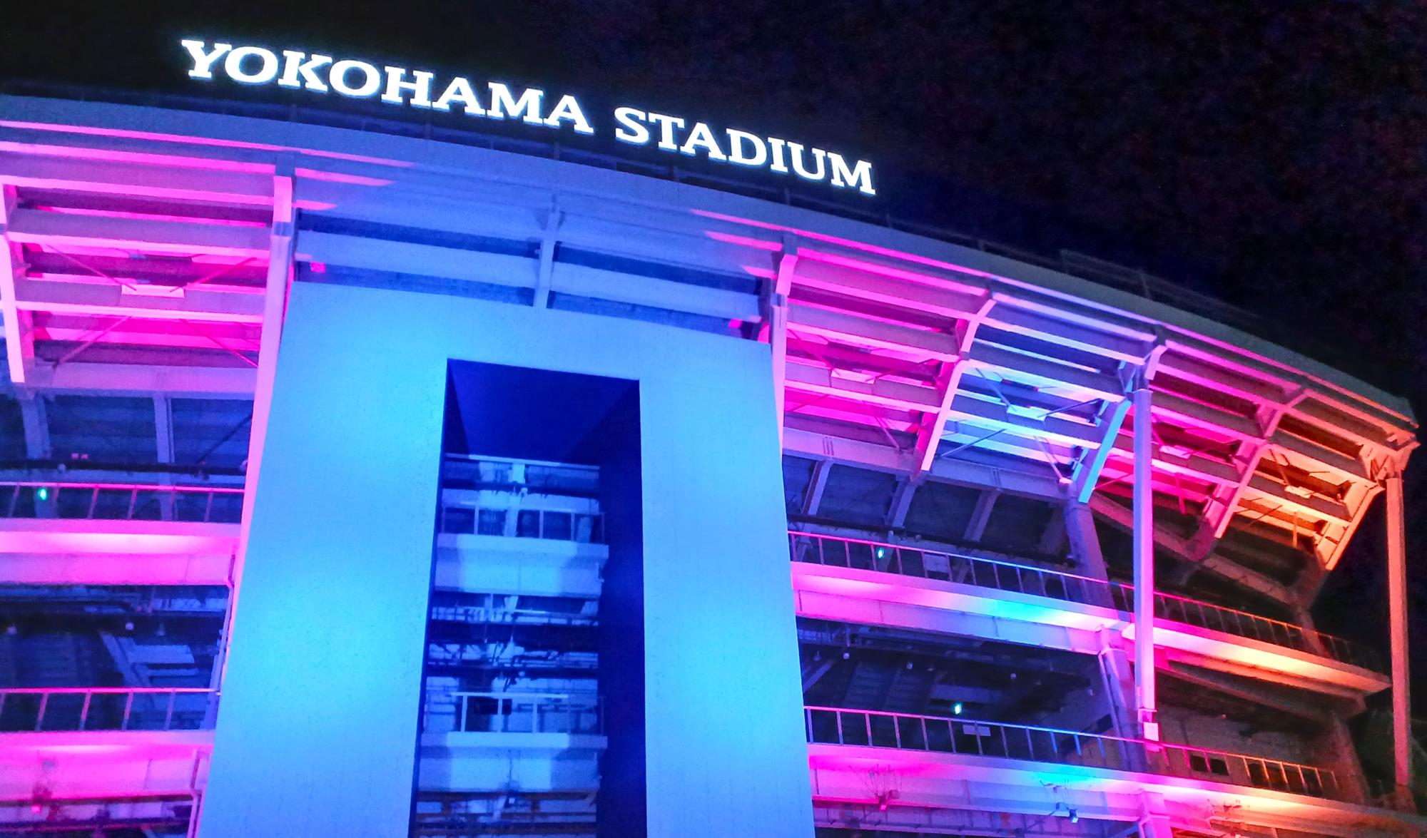 関内駅から横浜公園に向かうと、ハマスタがカラフルにライトアップされている。