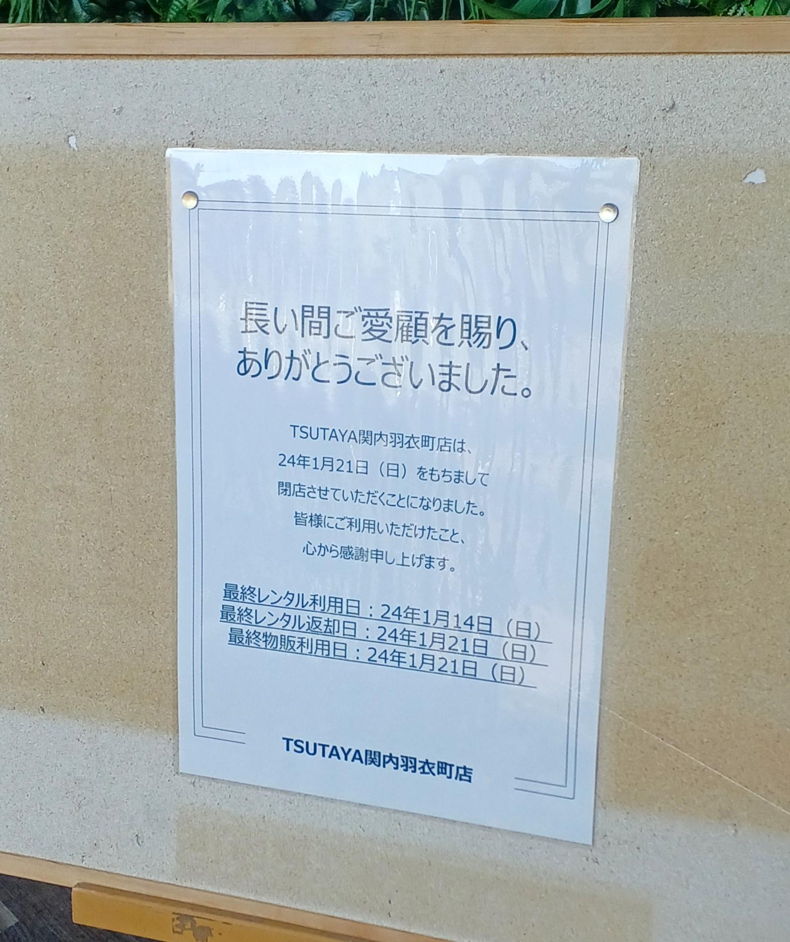 店頭には閉店を告げる張り紙が。レンタル最終日は1月14日(日)(返却の最終日は1月21日)、物販は営業最終日1月21日(日)まで。