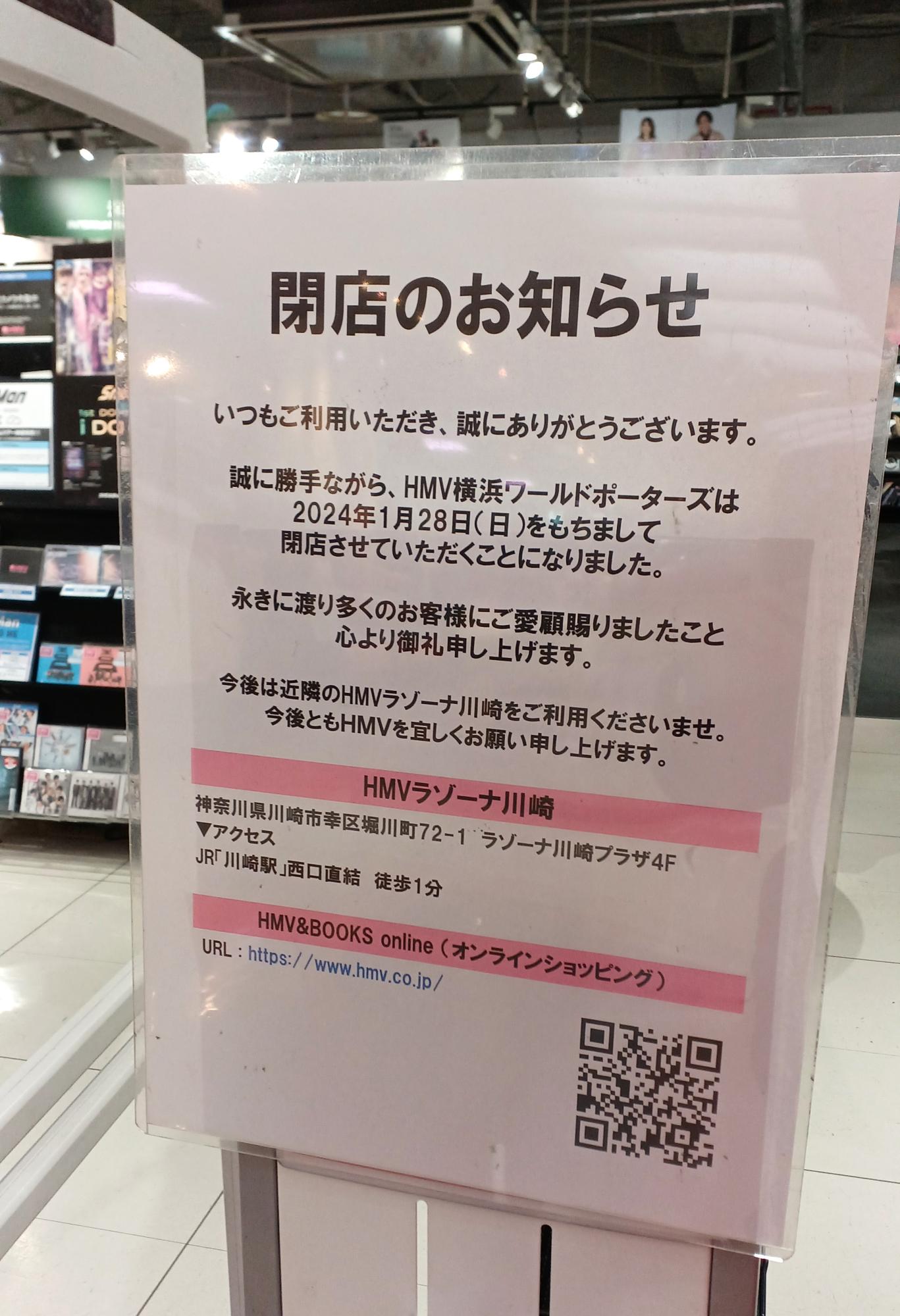 HMV横浜ワールドポーターズ店。2024年1月28日(日)をもって閉店する。