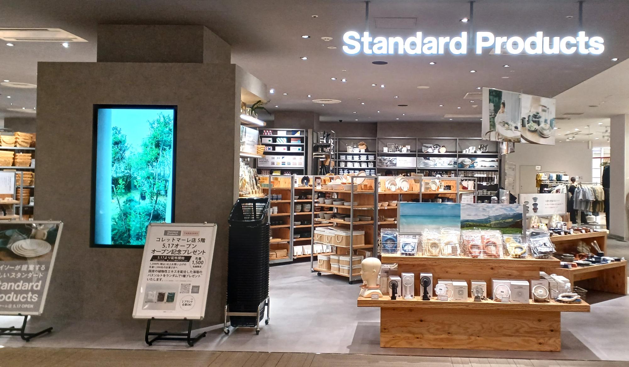 桜木町駅前のコレットマーレ5階。5/17(金)に「Standard Products(スタンダードプロダクツ)」と「THREEPPY(スリーピー)」の2店がオープンした。いずれも100円ショップのダイソー(大創産業)が手がけるブランドで、スタイリッシュでお得な生活雑貨が並ぶ。