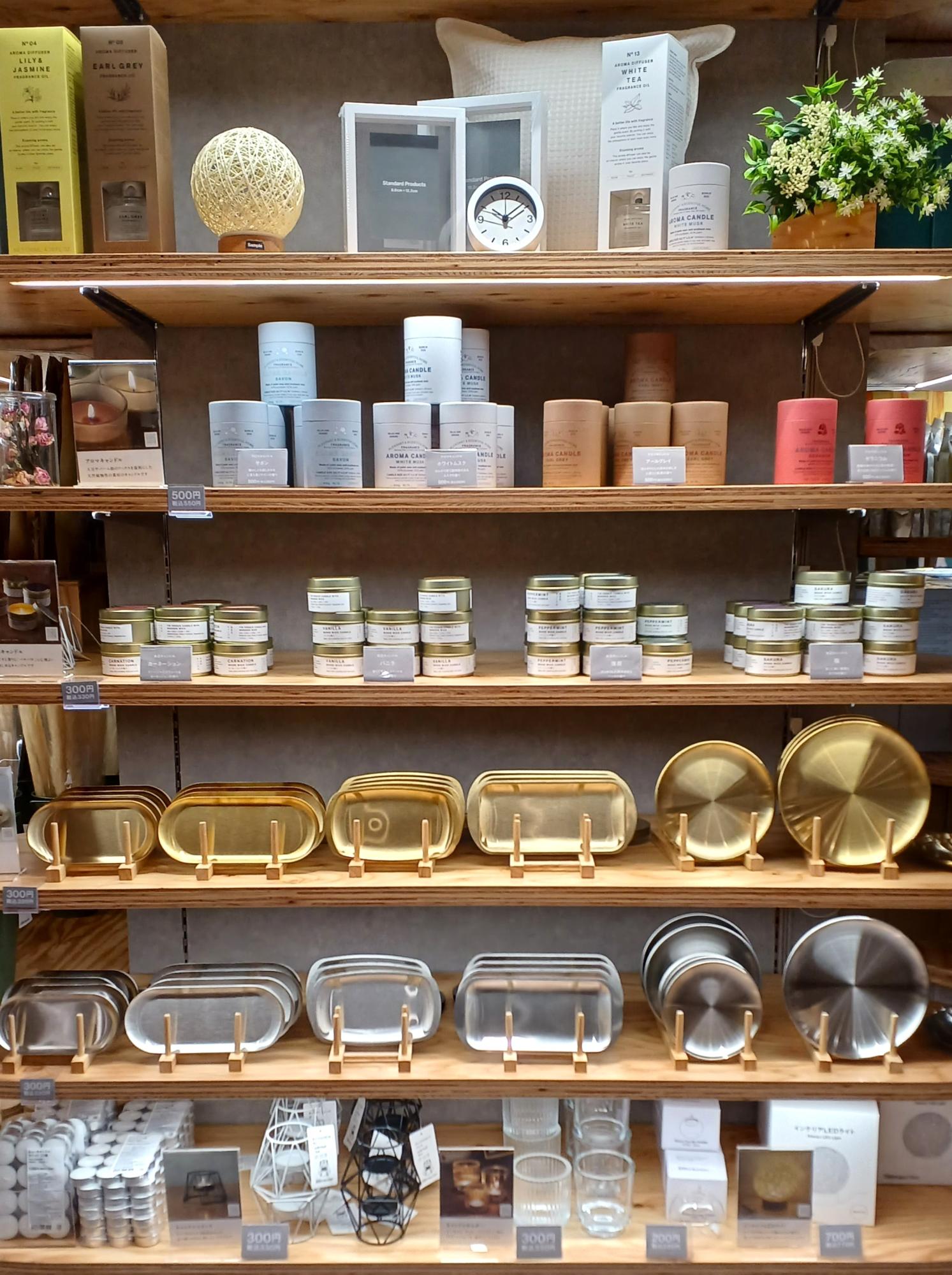 アロマキャンドルに木芯キャンドル。シックなデザインで、おしゃれ心をくすぐる。こちらも500円(税込550円)、300円(税込330円)といった値段の安さだ。