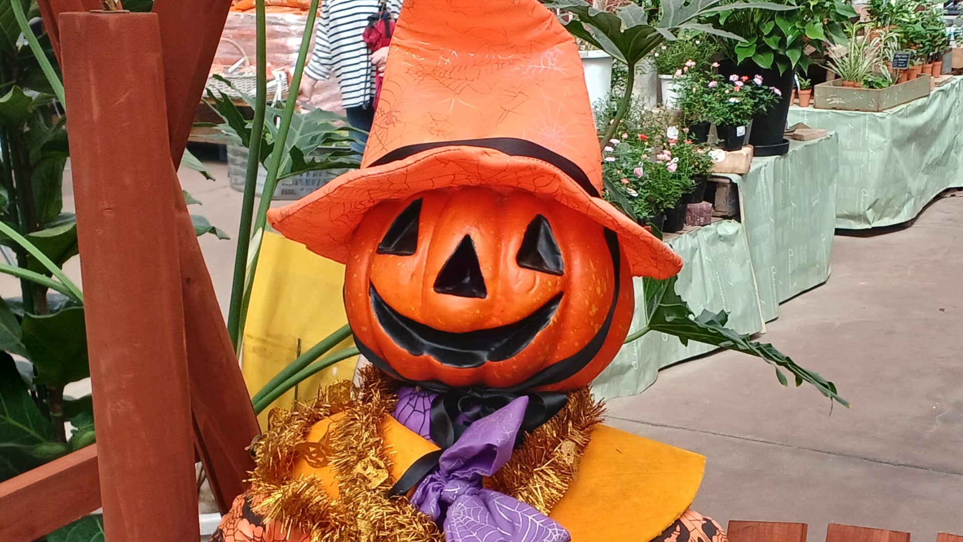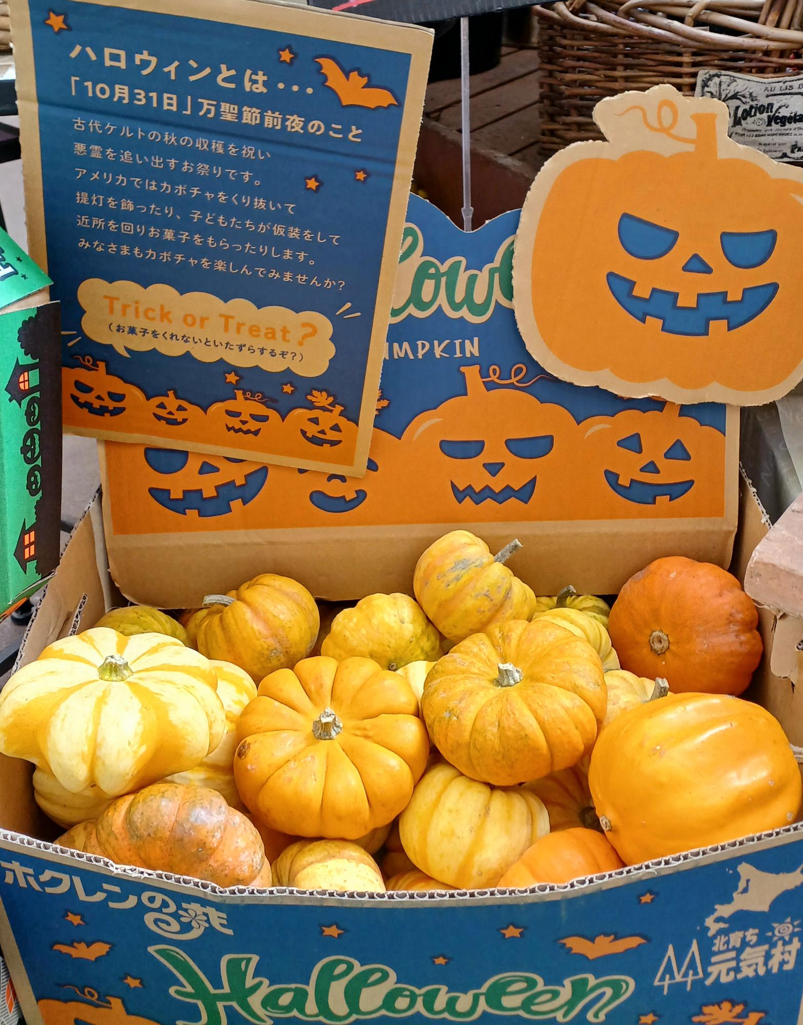 代表的な飾りが、カボチャをくりぬいて作る「ジャック・オー・ランタン(Jack-o’-lantern)」だ。グリーンファーム金沢本店の店内装飾では、胴体までつけてベンチに腰かけており、なかなかの存在感。