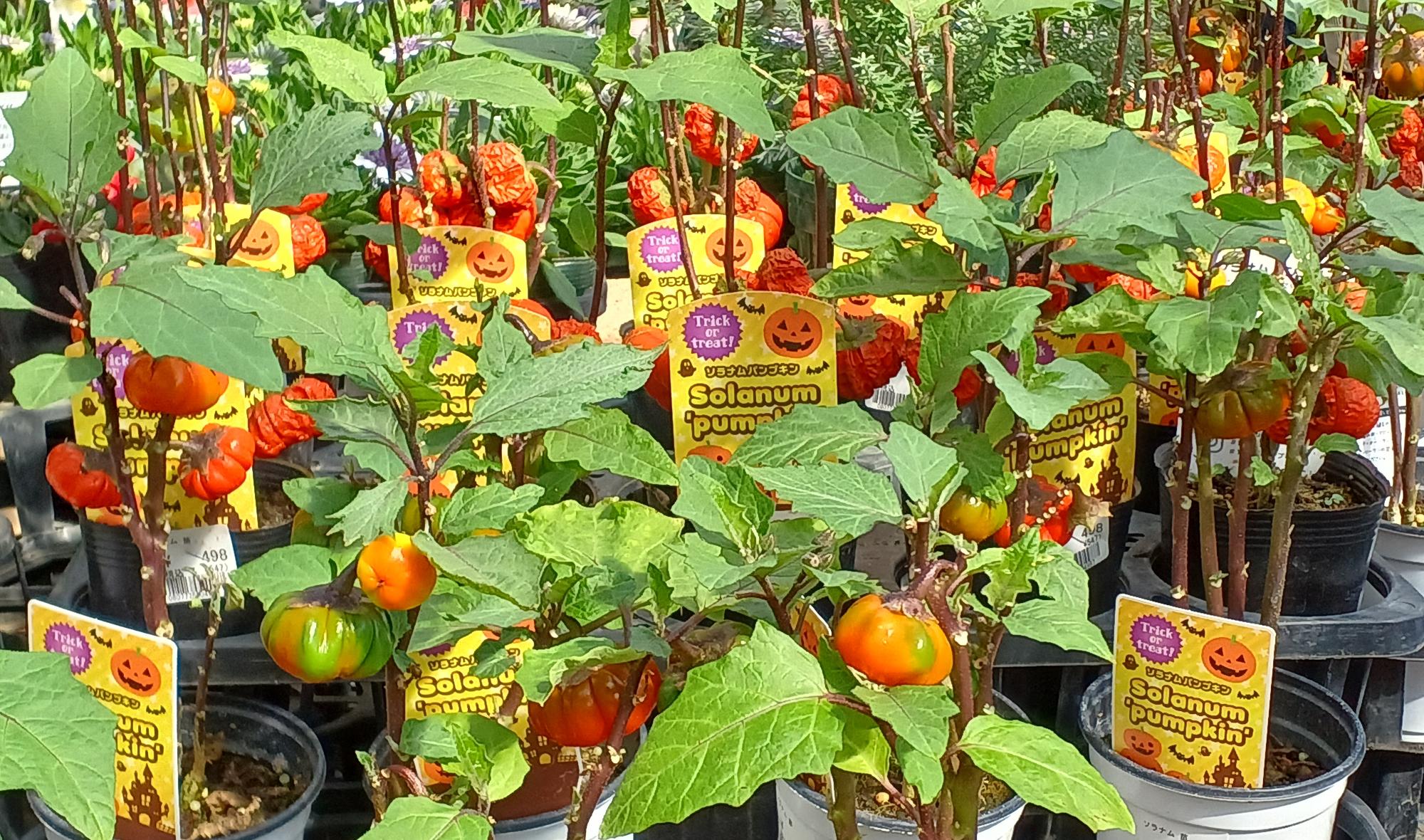 苗の売り場には、見た目がカボチャにそっくりな「ソラナム・パンプキン」があった。観賞用のナスだという。