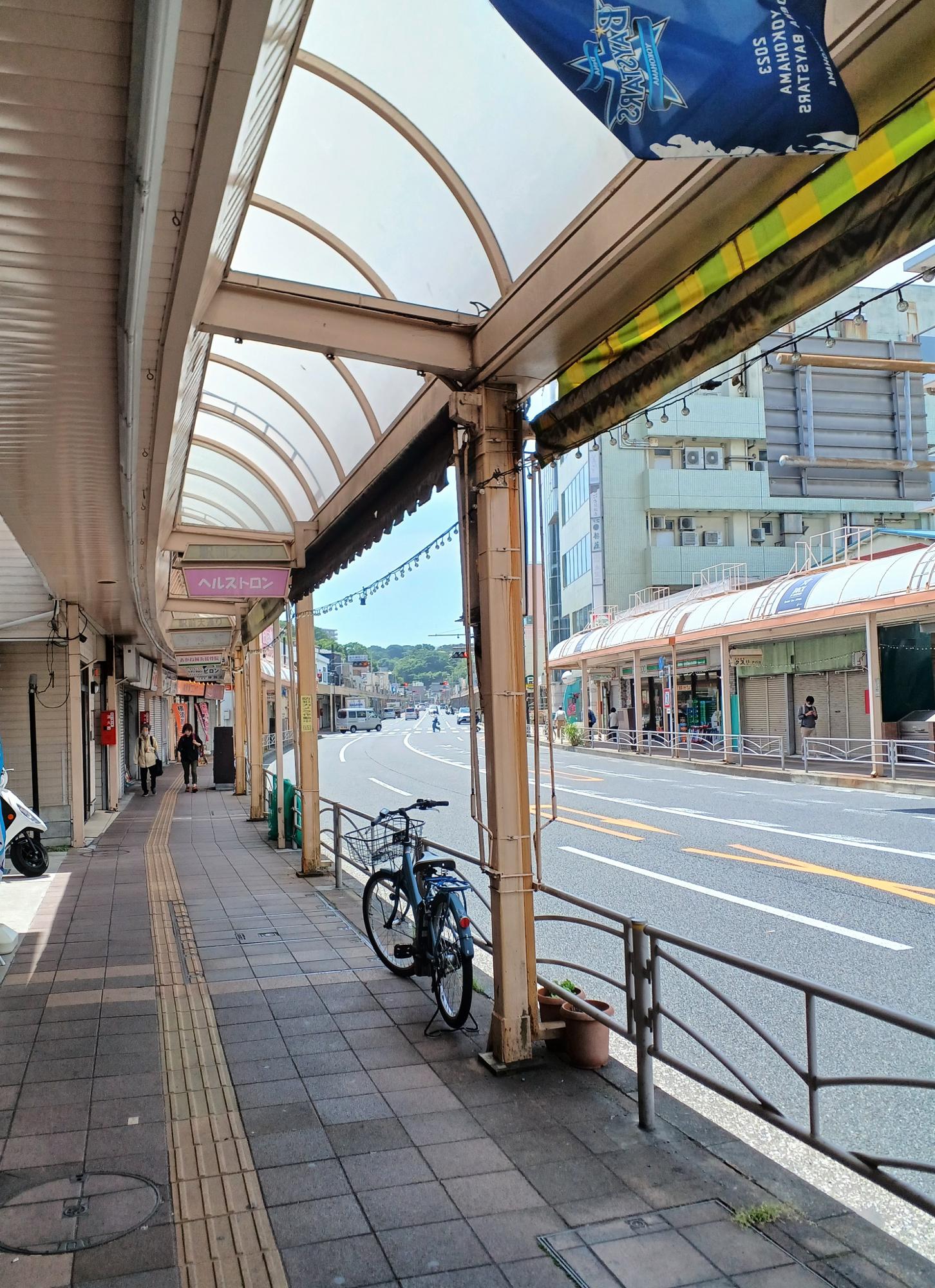 追浜駅東口を出て南に向かう商店街。GW中はお休みの店舗も多くありましたが、昔ながらの海沿いの街といった風情があり、早くも旅気分に。土地が平らで歩きやすい。