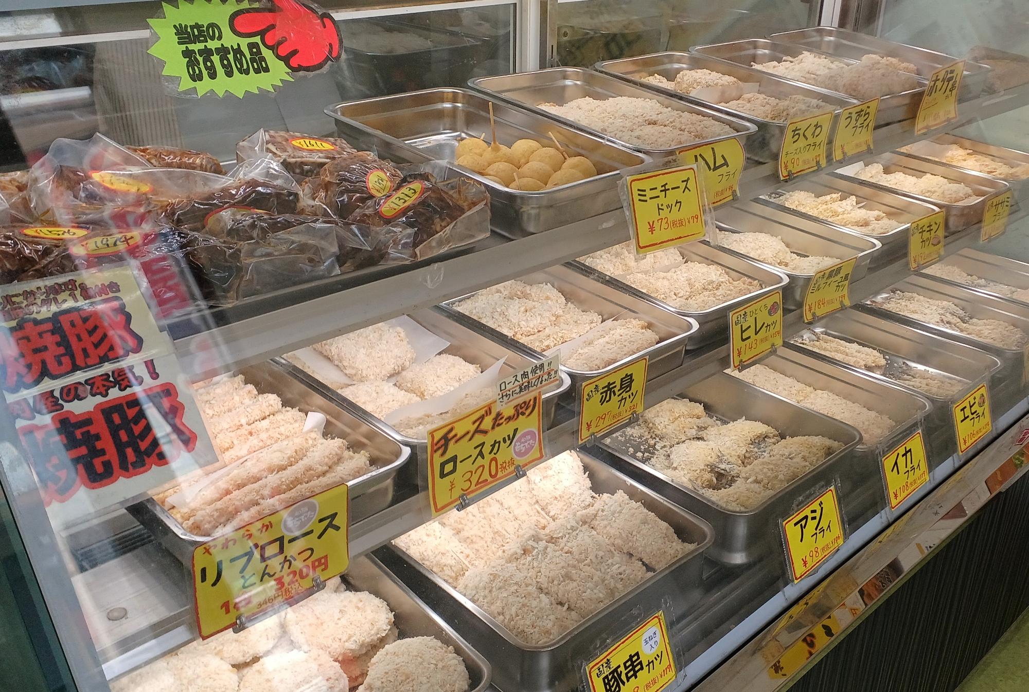 「あとは自宅で揚げるだけ」の惣菜も多数!ハムフライ、うずらフライ、ロースカツ、アジフライ、イカフライ、エビフライ…フライ天国だ!!コロッケの揚げ方は、お店のホームページでも写真付きで解説されています。