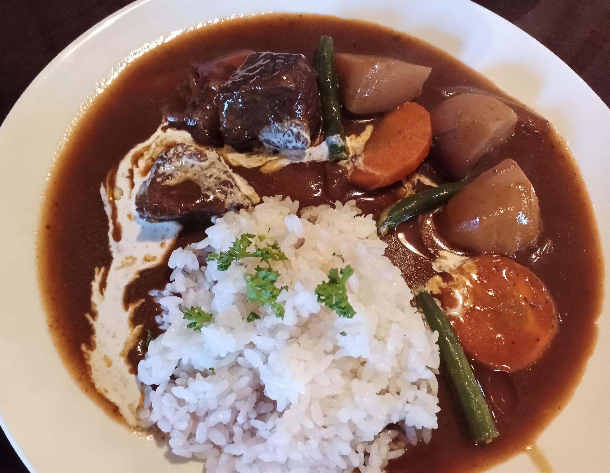 ランチメニューは「季節のランチプレート」「ビーフシチュー」「チキンドリア」「タコライス」などから選び、スープ・サラダ・ドリンク付き。写真は「ビーフシチュー」、赤ワインの深みが感じられる優しい味付けでした。