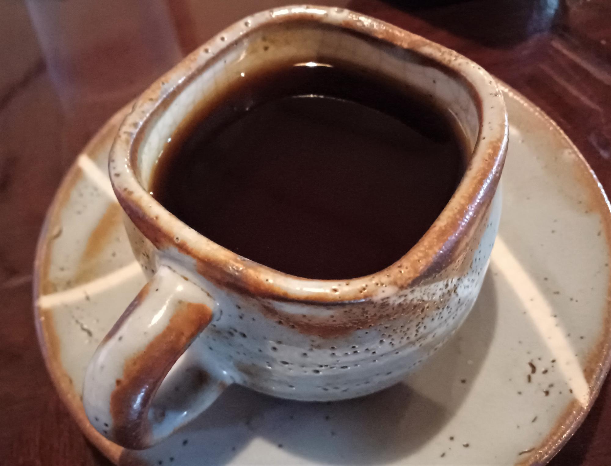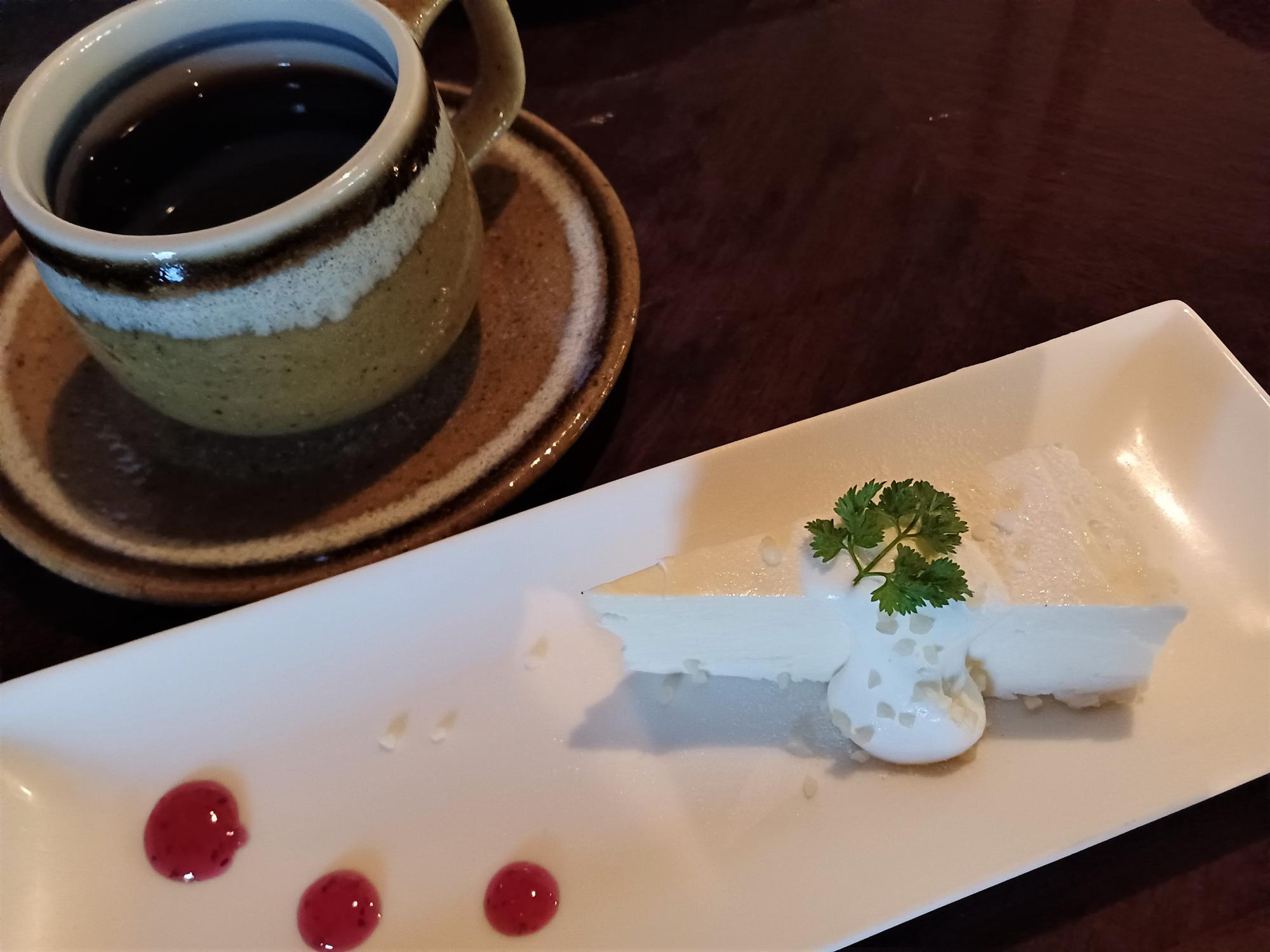 デザートも付けることができ、レアチーズケーキをコーヒーとともにいただきます。コーヒーはブラジル豆の深煎りドリップ。
