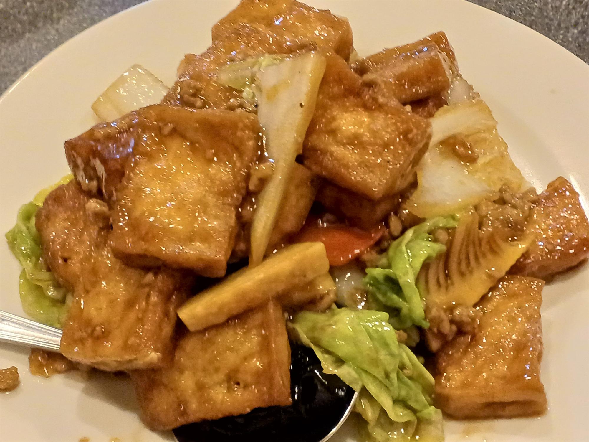 「北京焼豆腐」。揚げたての豆腐が使われているとのことで、香ばしくなった豆腐の外周が美味。甘めでコクがある醤油の味で、箸が止まらない、ビールが止まらない。