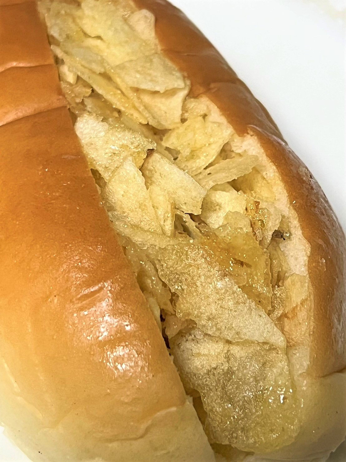 ポテチパンはものすごく甘い。ポテトチップスに砂糖がからめられており、さらに辛子も入って、これ以上ないほどのジャンキーな味わい。辛子は、「タマゴサンドの端っこにたくさん辛子が残っていた!」といった調子で入っています。