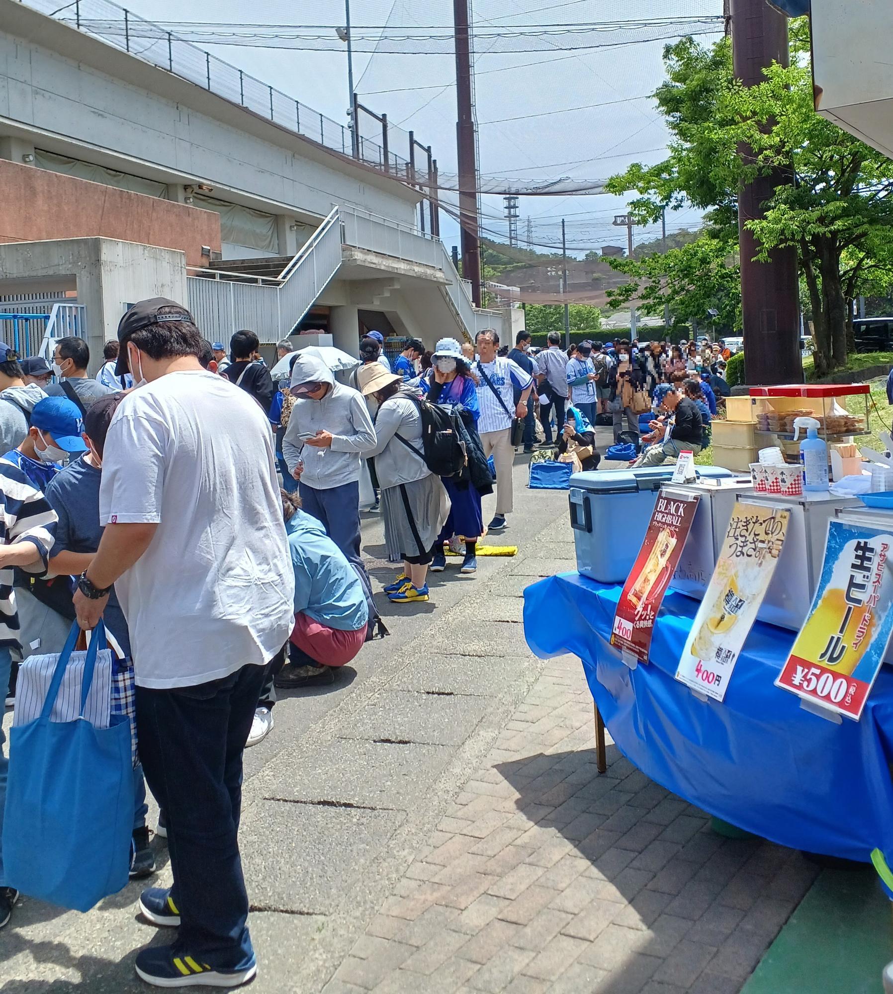 この日は埼玉西武ライオンズとの試合開催日。大人1200円、子供500円でファーム戦(二軍チームの試合)が見られます。写真は試合開始2時間前、入場券購入のための列がすごい!(全席自由席)