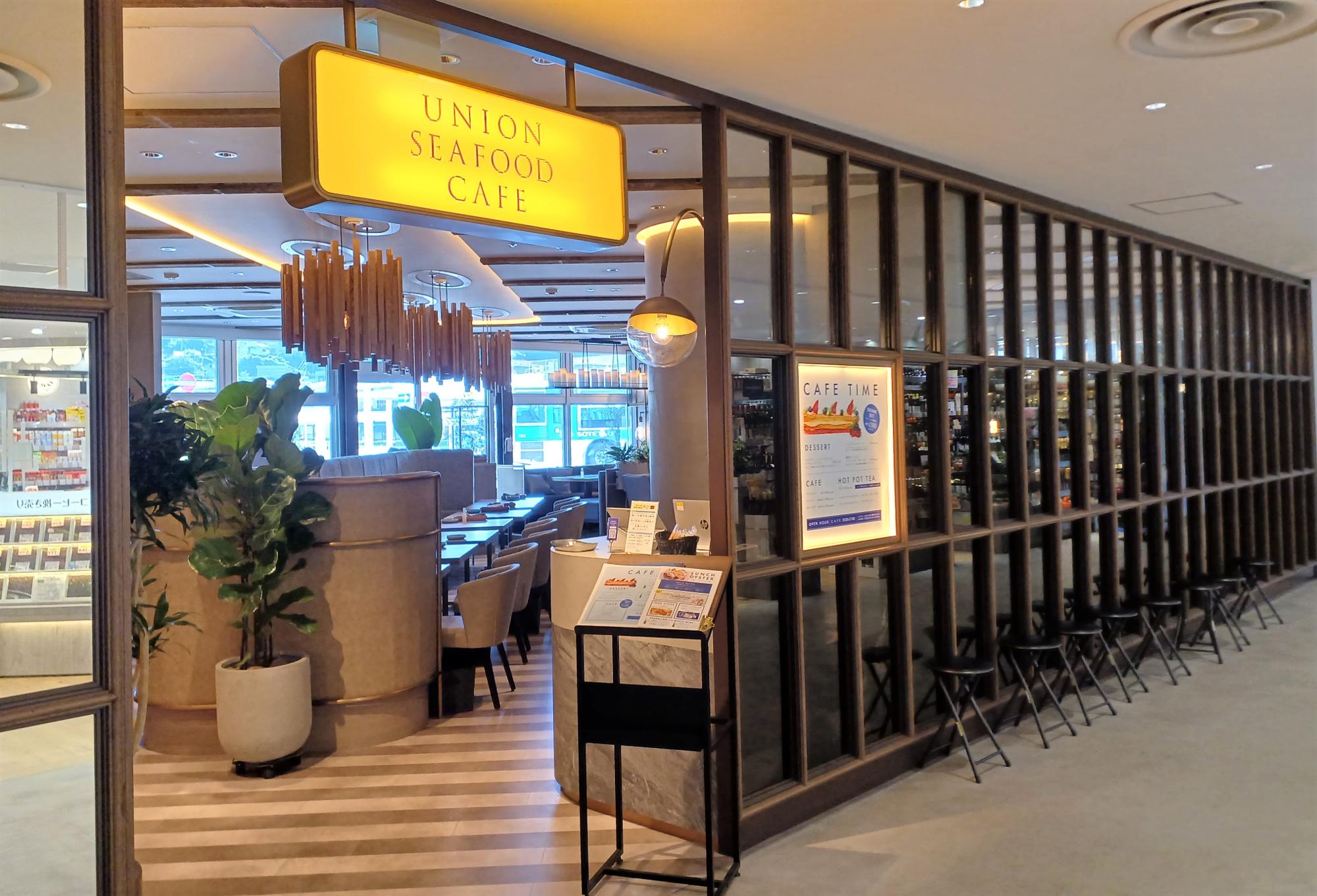 レストランの「UNION SEAFOOD CAFE(ユニオンシーフードカフェ)」。ランチはパンビュッフェ、ディナーには生牡蠣をはじめとした鮮魚料理・イタリアン料理をいただけます。