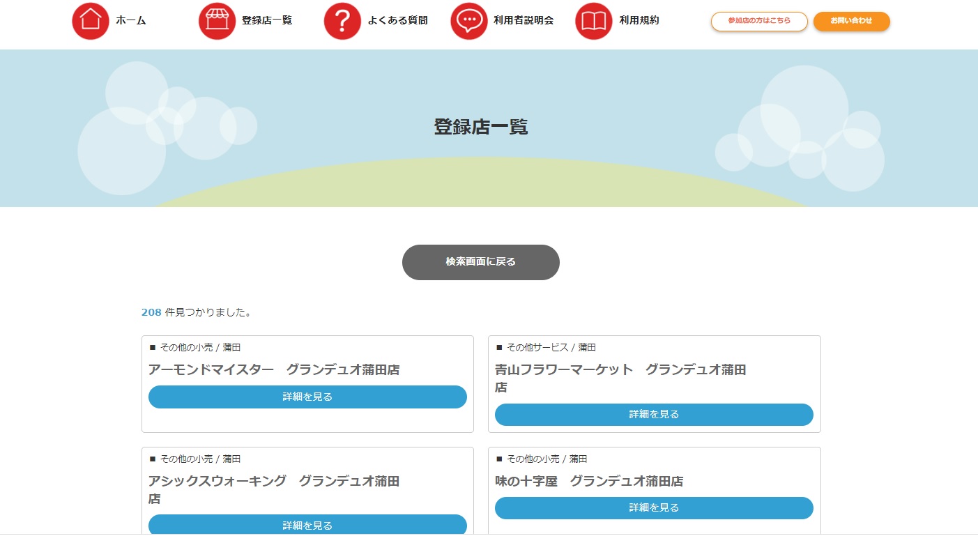 スーパーマーケットでは、オーケーや東急ストアが多数参加しており、駅ビルではグランデュオ蒲田に参加店舗が多い。使えるお店は最寄り駅でも検索可能。