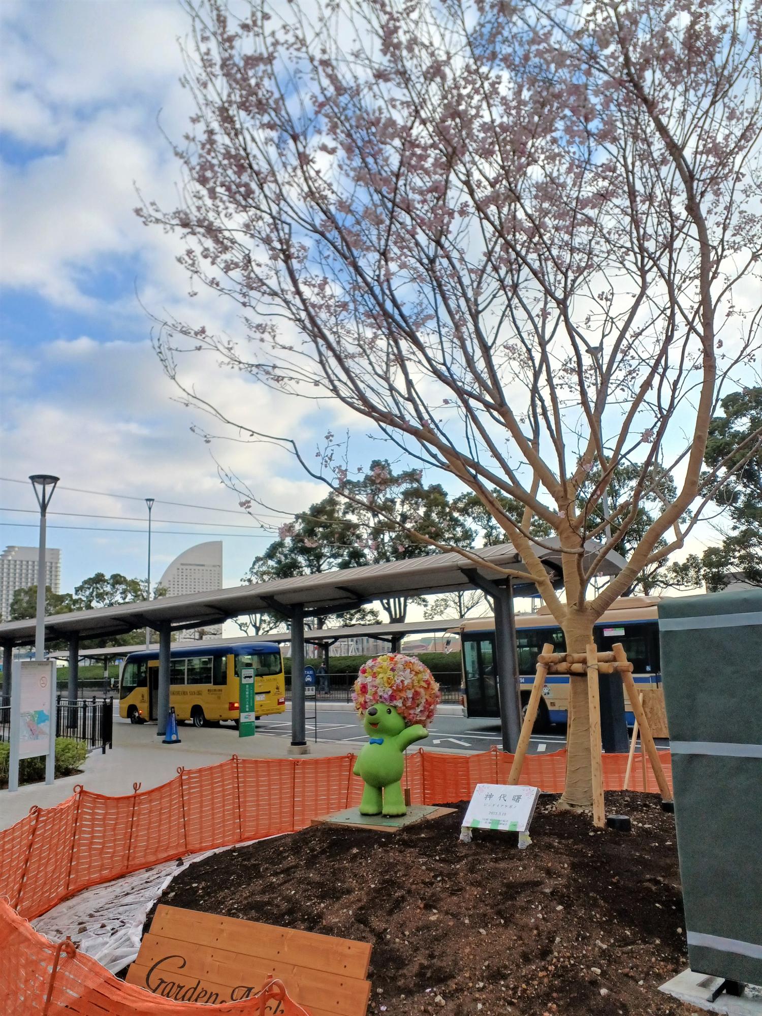 桜木町駅前には2023年3月19日の日付で、「神代曙」という品種の植樹準備が進められていました。この若木はしっかりと花をつけています。