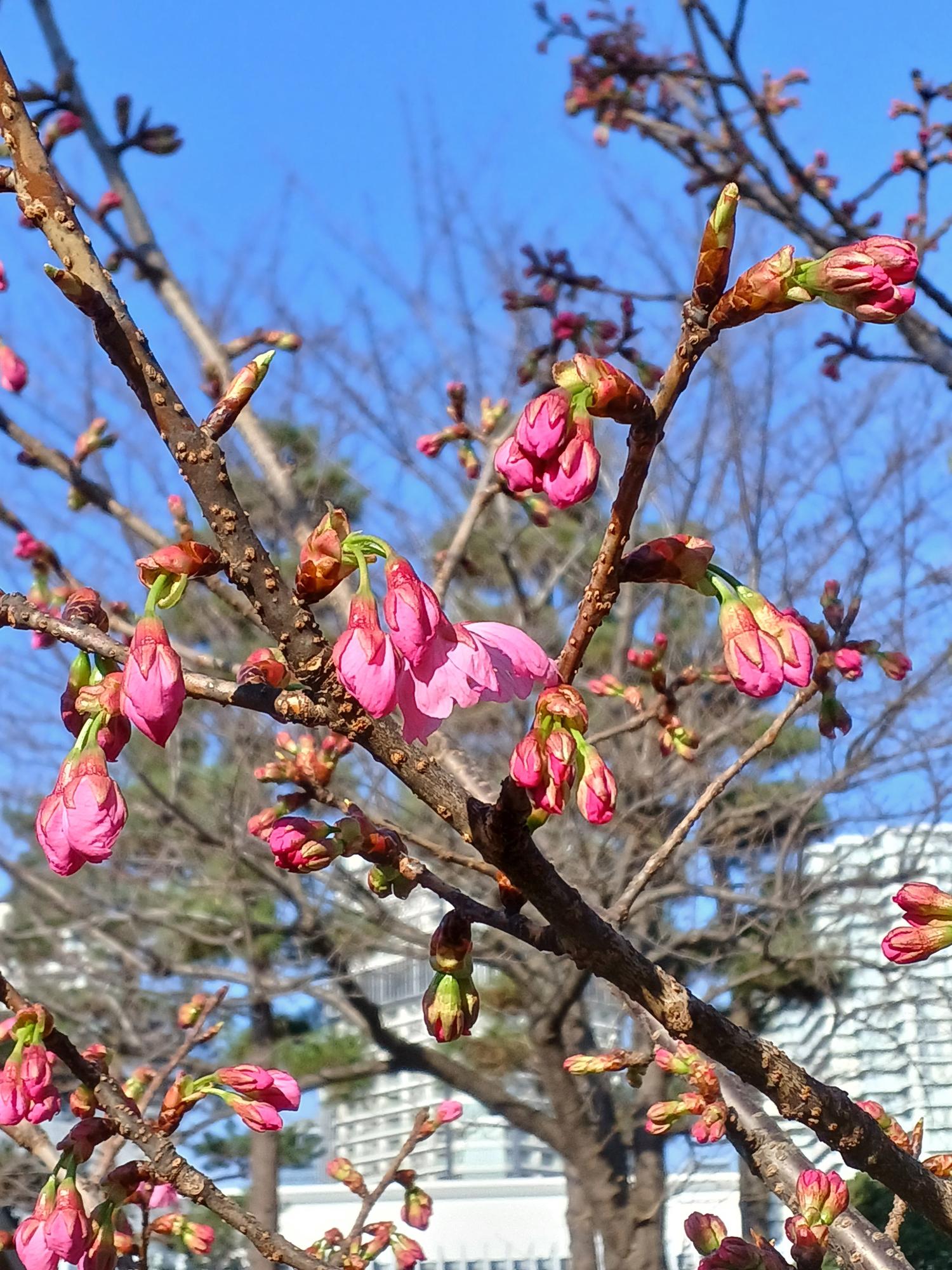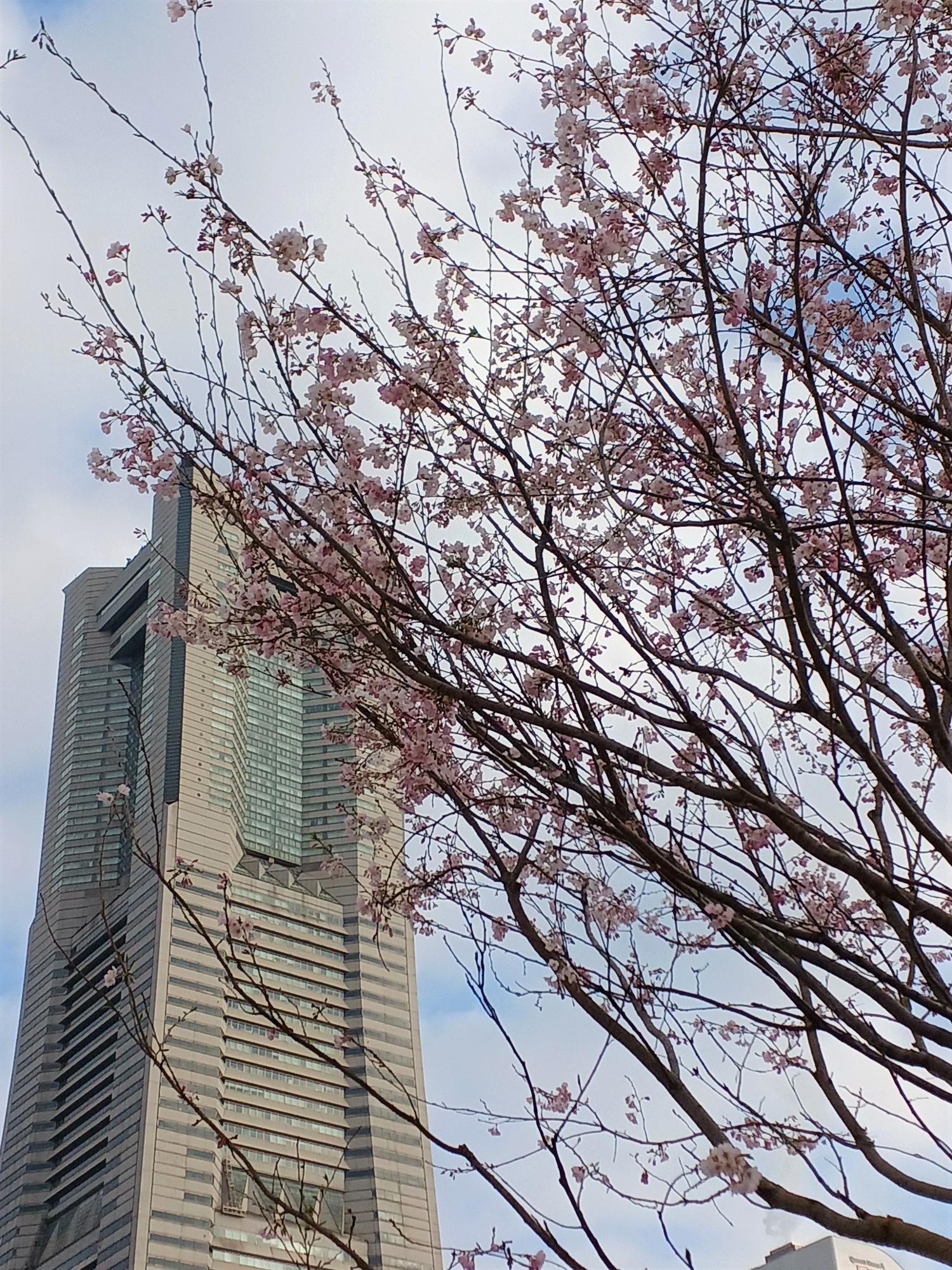 遠くにピンク色が見える気がする!と思い近づく。パシフィコ横浜の裏手近くには、濃いピンク色の桜が一分咲き。