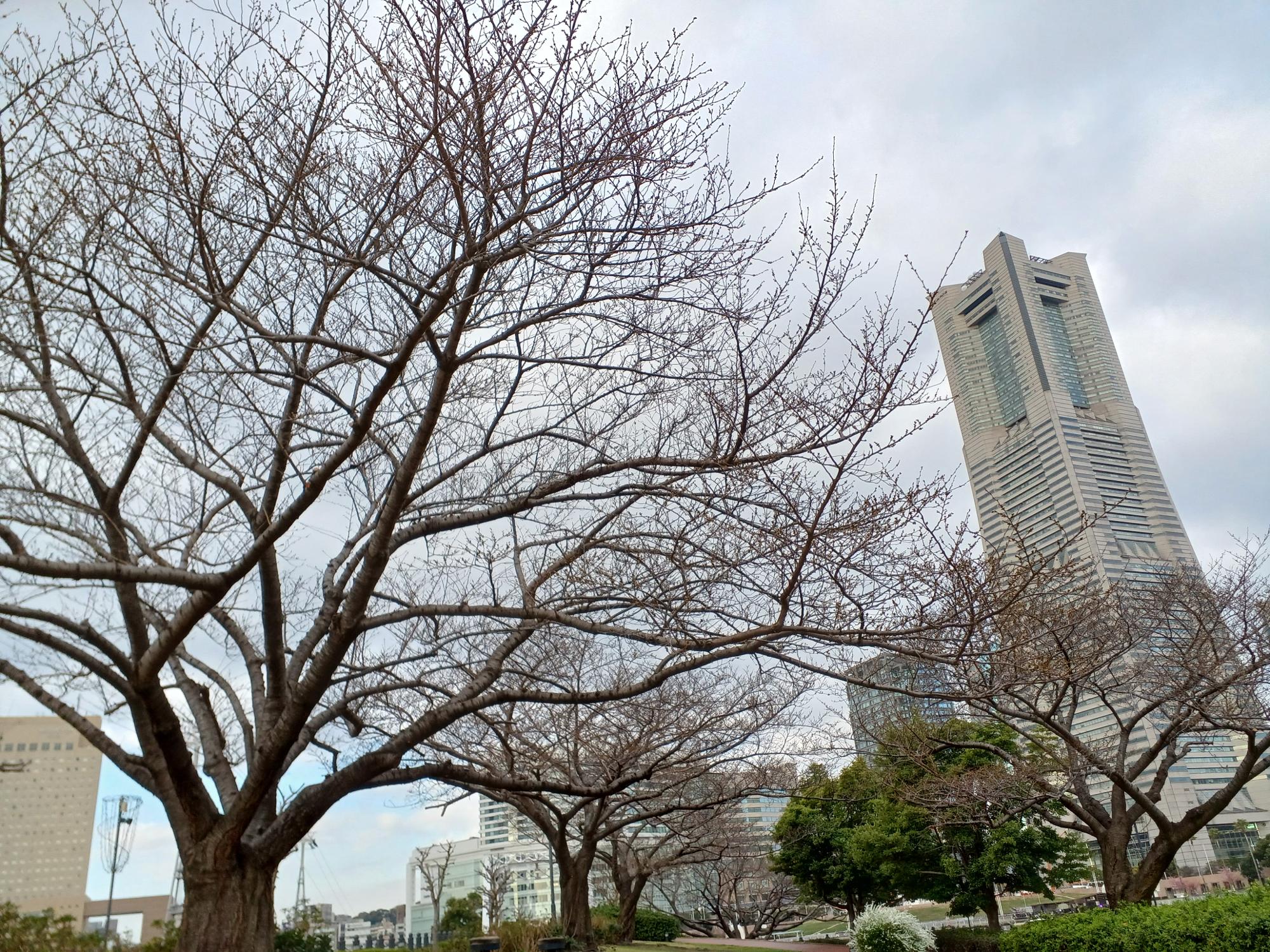 桜を探して、桜木町駅から臨港パーク方面へ。まだまだ青く、開花が確認できる木はわずかです。早咲きの品種は臨港パークにありました。花と言えばコブシやユキヤナギは目に留まりましたが、桜については花見の下見をするにも、まだ早いくらいかもしれません。