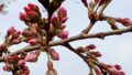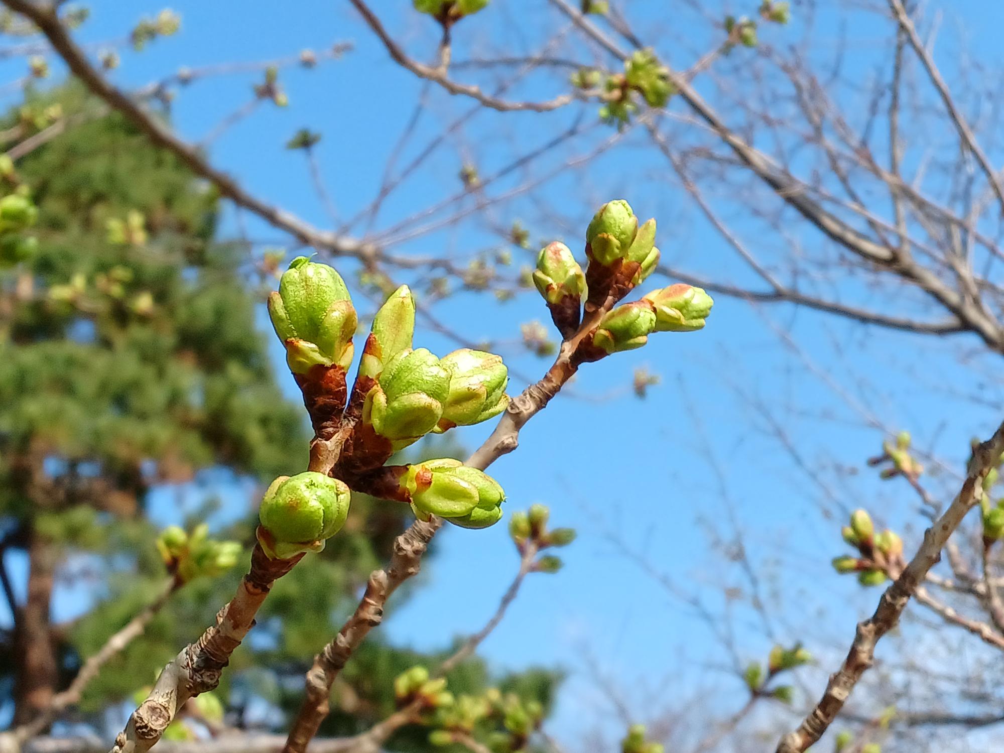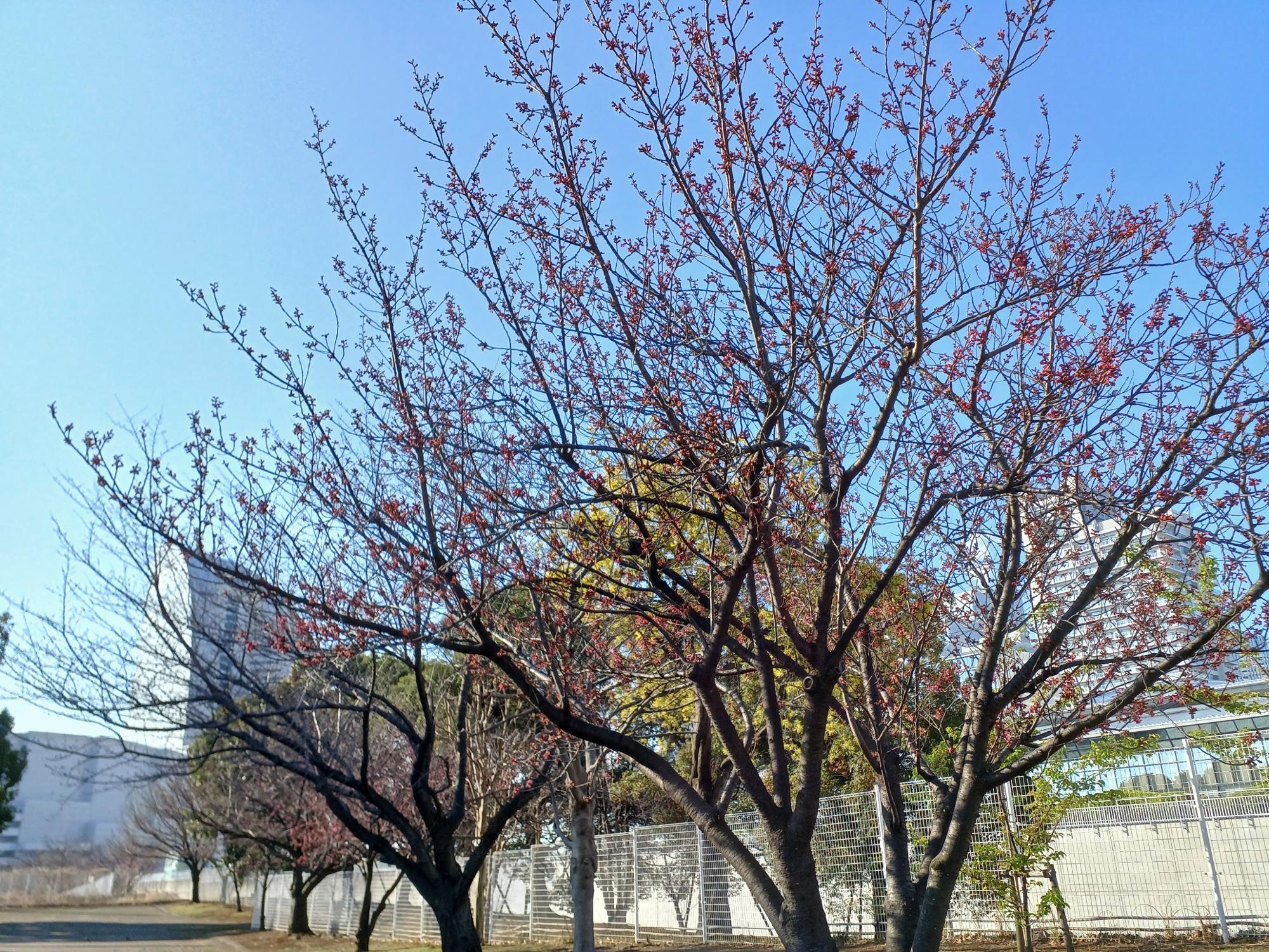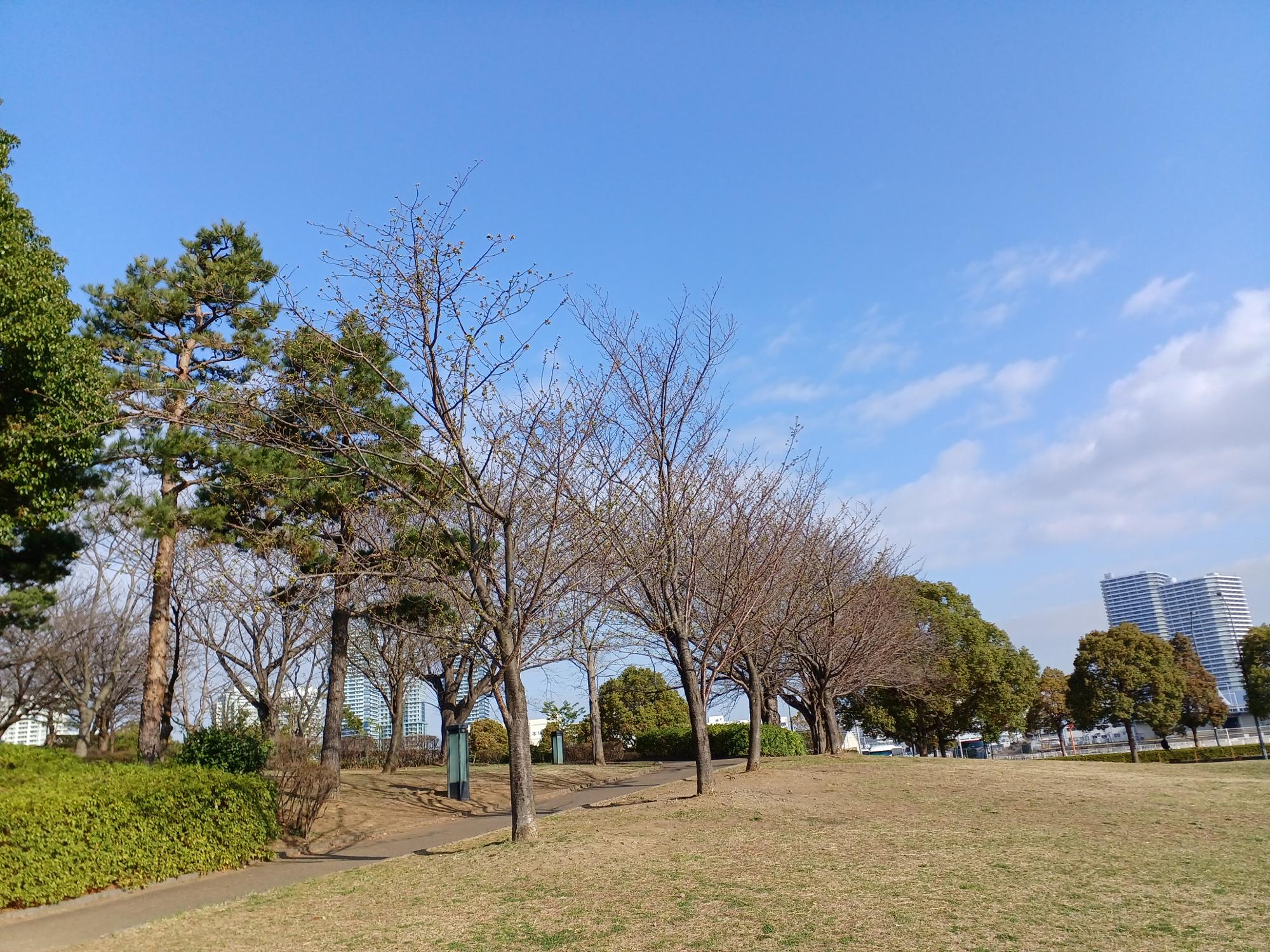 臨港パークを北側の奥まで進むと、桜の植えられたエリアが。こちらも汽車道同様に青いつぼみばかりでした。