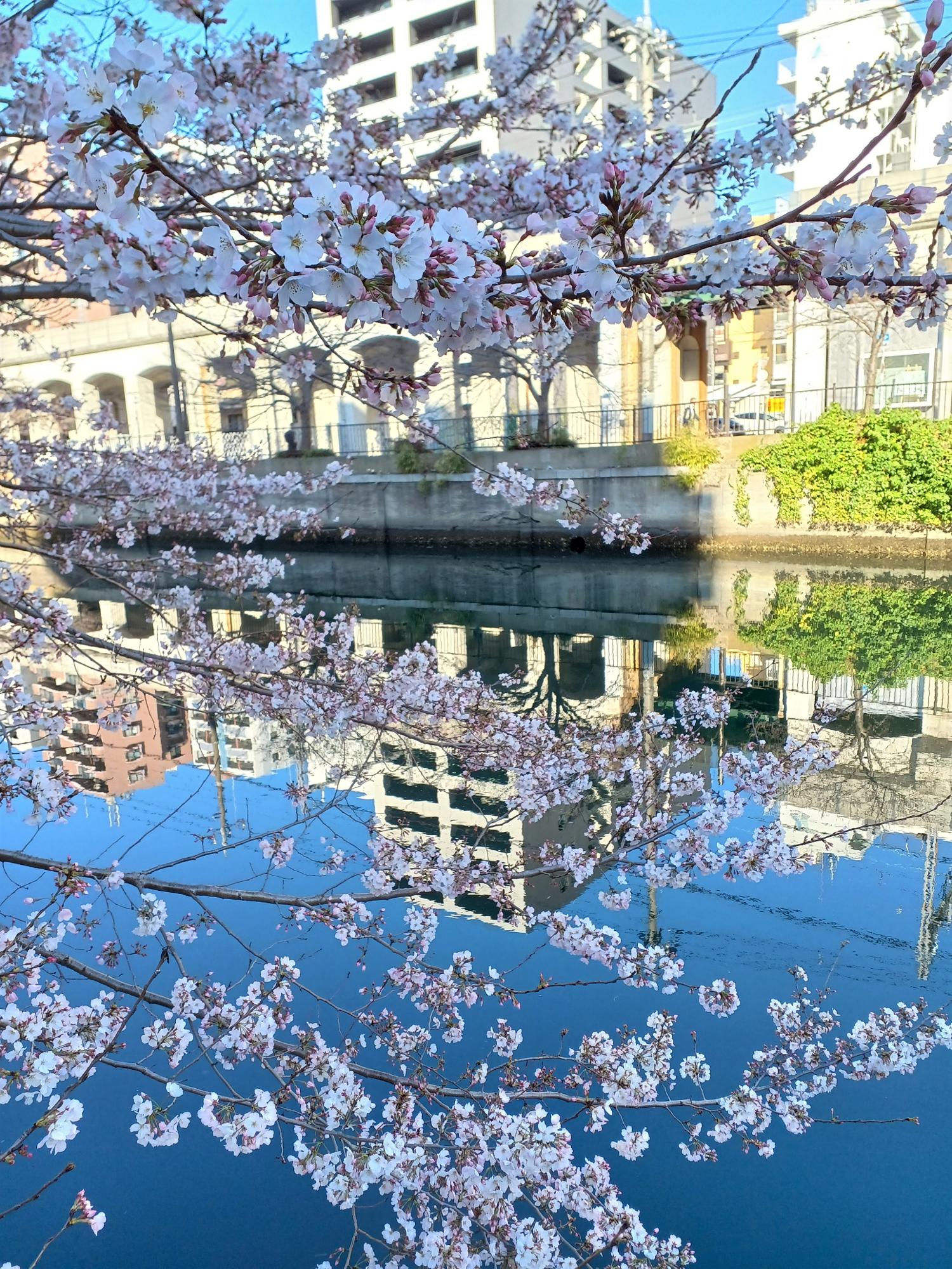 川の東側(伊勢佐木町側)が特によく咲いており、桜並木を実感できます。