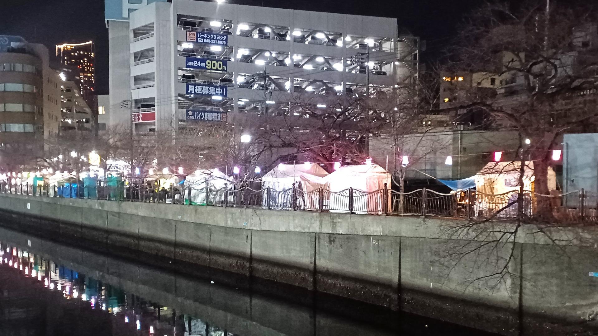 今か今かと待たれる桜の季節だが、大岡川での開花までは、まだしばらく。桜木町駅から旭橋(日ノ出町駅付近)を歩いてみた。川沿いの夜間ライトアップは開始しており、「長者町桜まつり」の屋台テントも営業している。