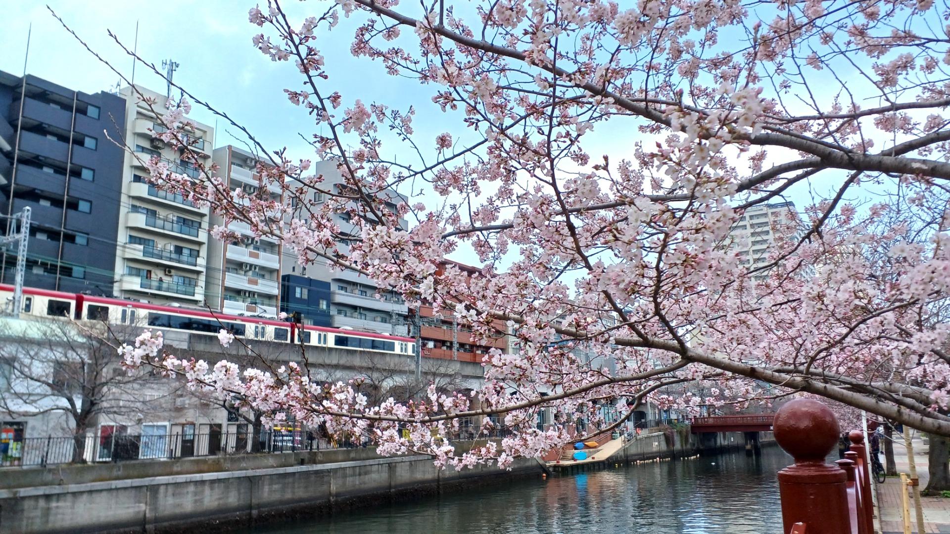 京急日ノ出町駅近くの大岡川(横浜市中区日ノ出町)。川の東南側(桜木町駅を背にして左側)が一気に咲き始めた。