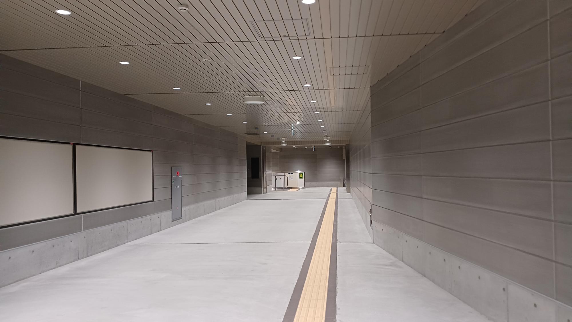 要塞のような地下通路。手前には広告が貼られており、営業中の雰囲気もなくはないが、まだまだ新駅である。