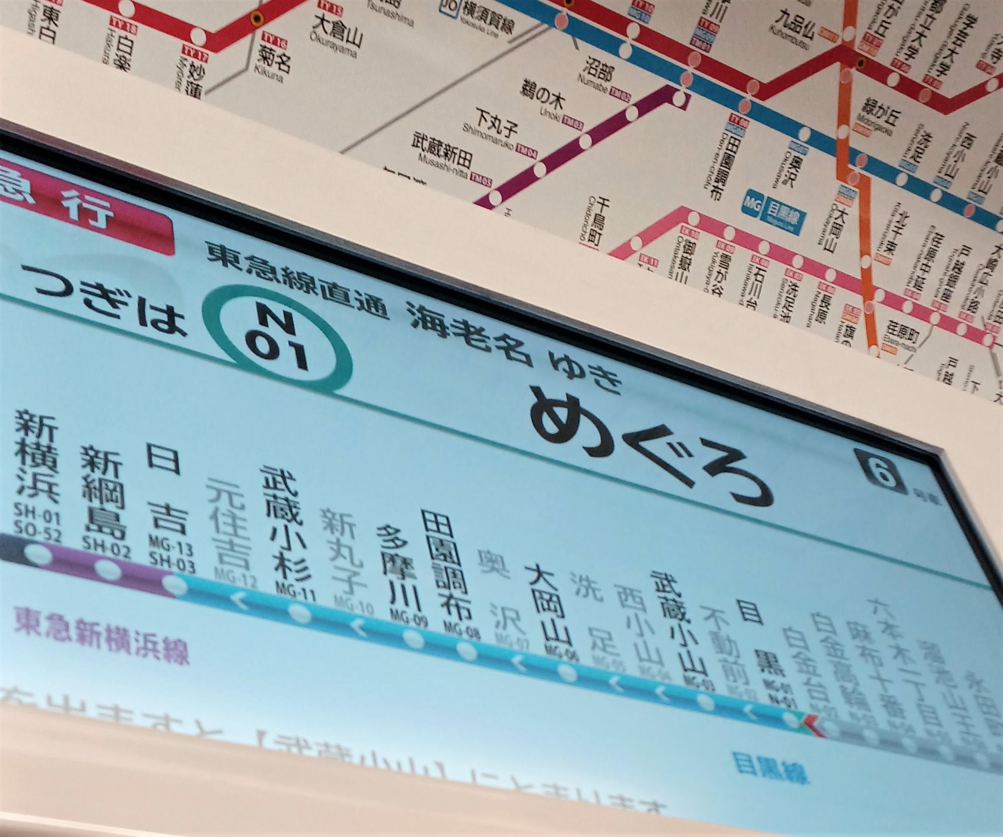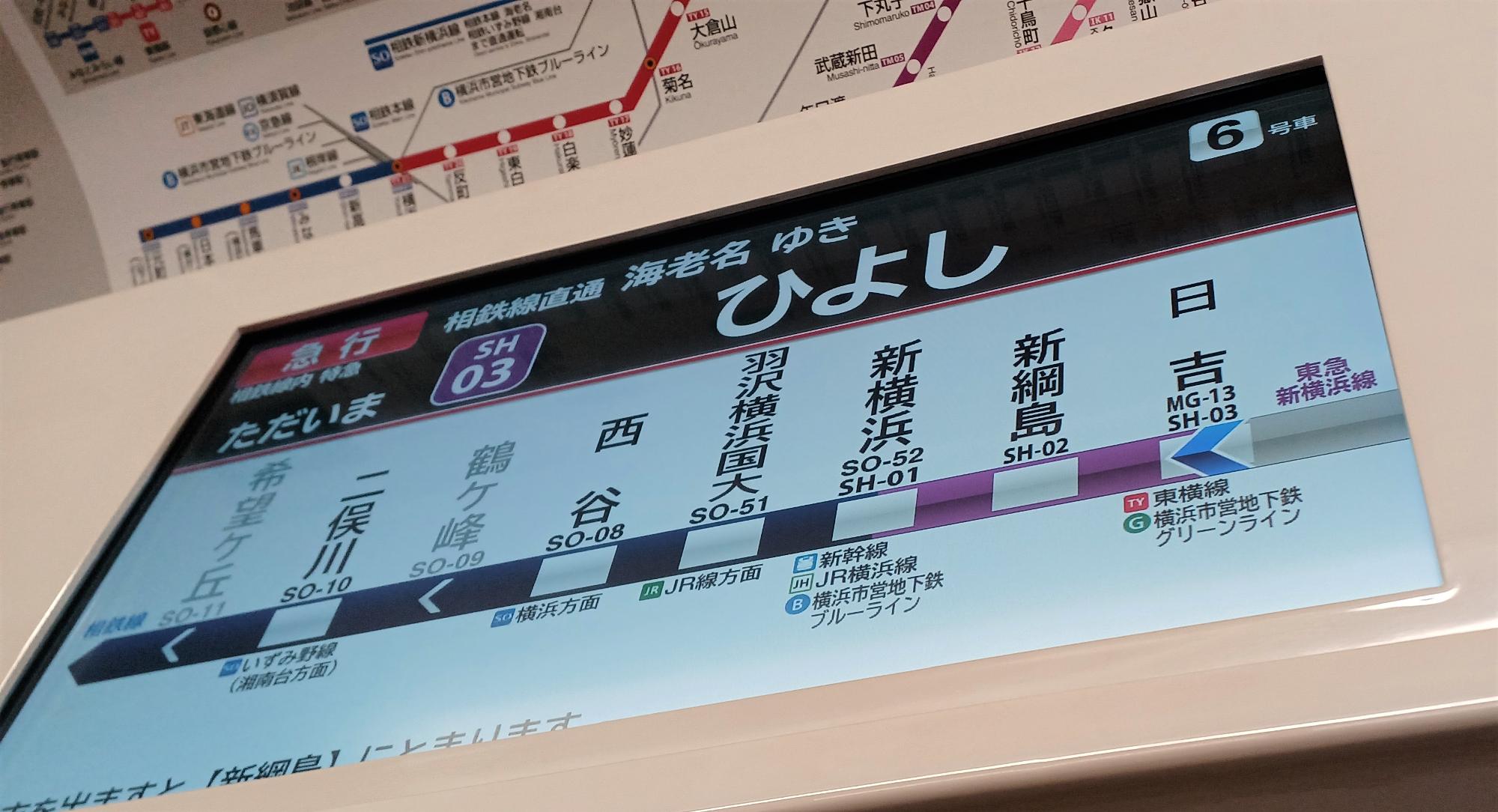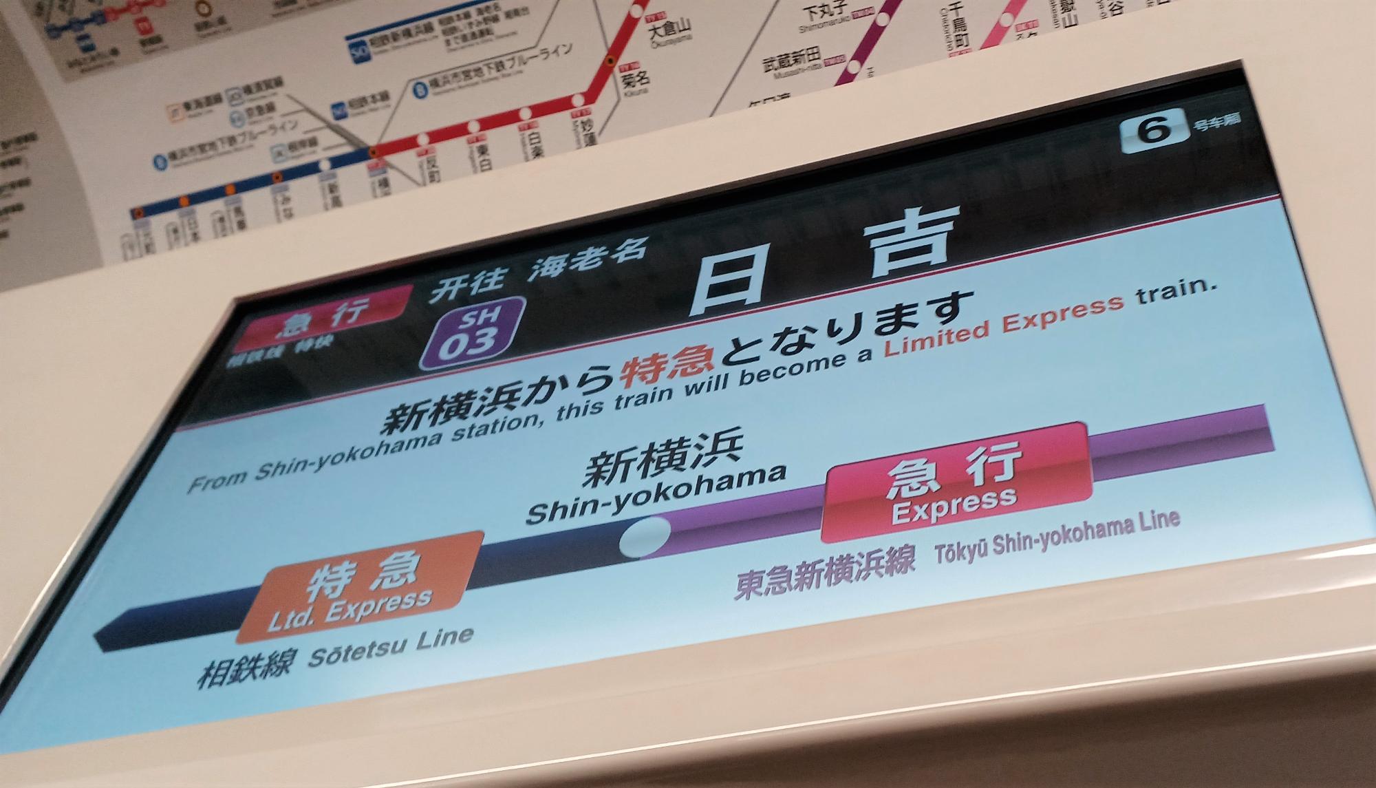 さて、都内から新横浜線直通電車に乗った場合。乗り入れ先が長く、目黒の時点では路線表示が新横浜までしか入らない。車内アナウンスによると、この電車は「東急新横浜線相鉄線直通急行海老名行」(!)。