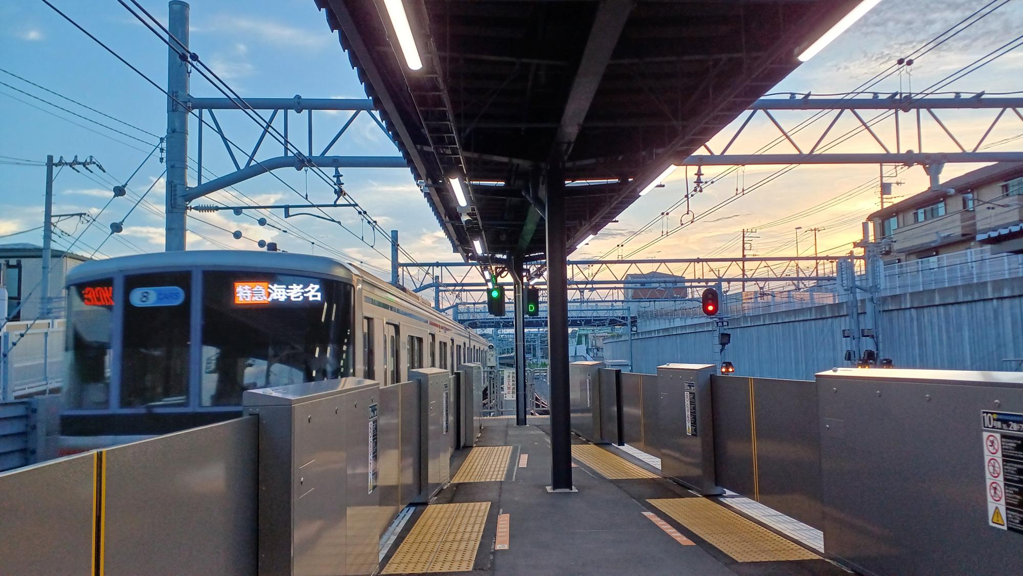 夕日に向かって走り出す、特急海老名行。地上駅の西谷に着いて、ほっと一息ついたのだった。