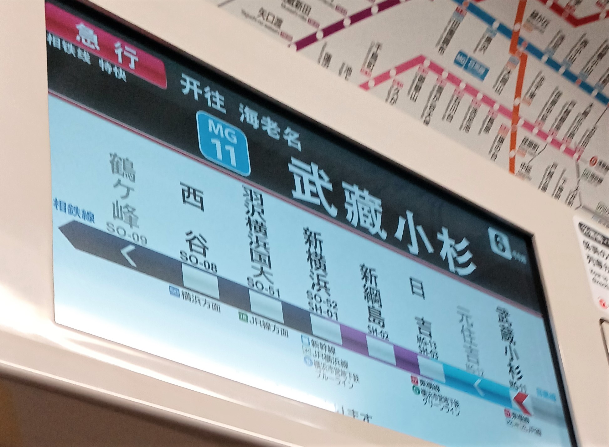一体いくつの路線に乗り換え可能なのか…車内の乗り換え案内表示もめまぐるしい。日吉駅に着くころ、路線案内に二俣川が登場した。