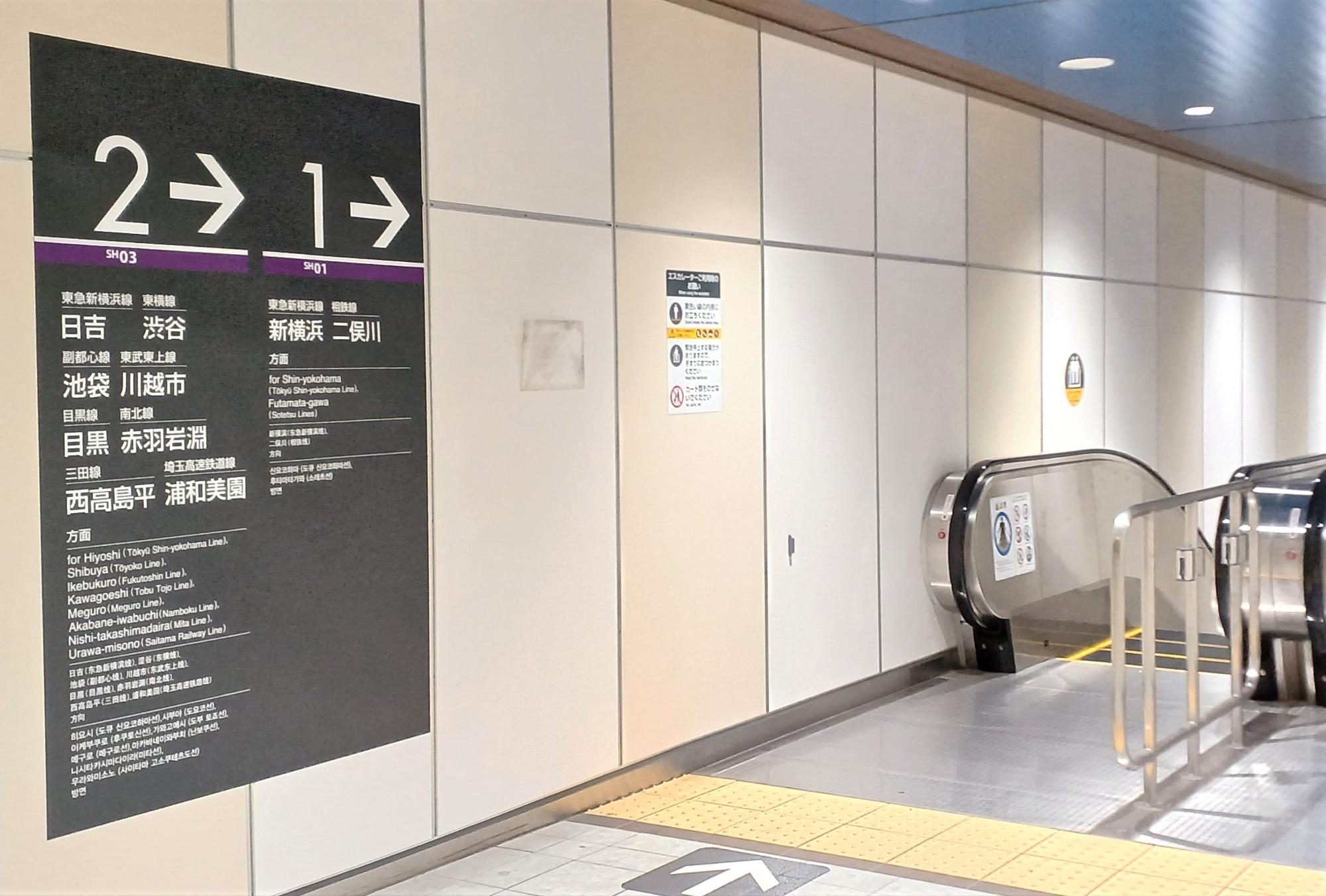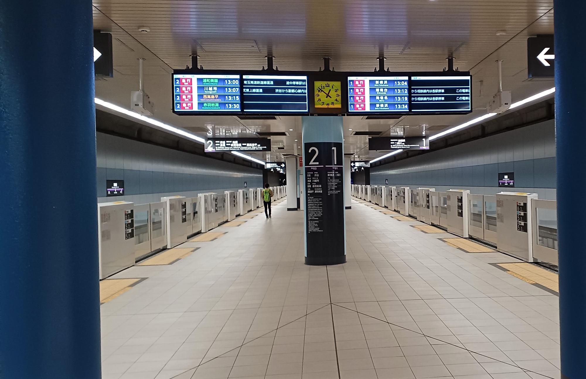 上り方面の行先、東横線でお馴染みの「日吉」「渋谷」を筆頭に、「池袋」「川越市」「目黒」「赤羽岩淵」「西高島平」「浦和美園」とある。東京メトロ南北線や都営地下鉄三田線にまでつながっていて、訳が分からない!というのが正直な感想。