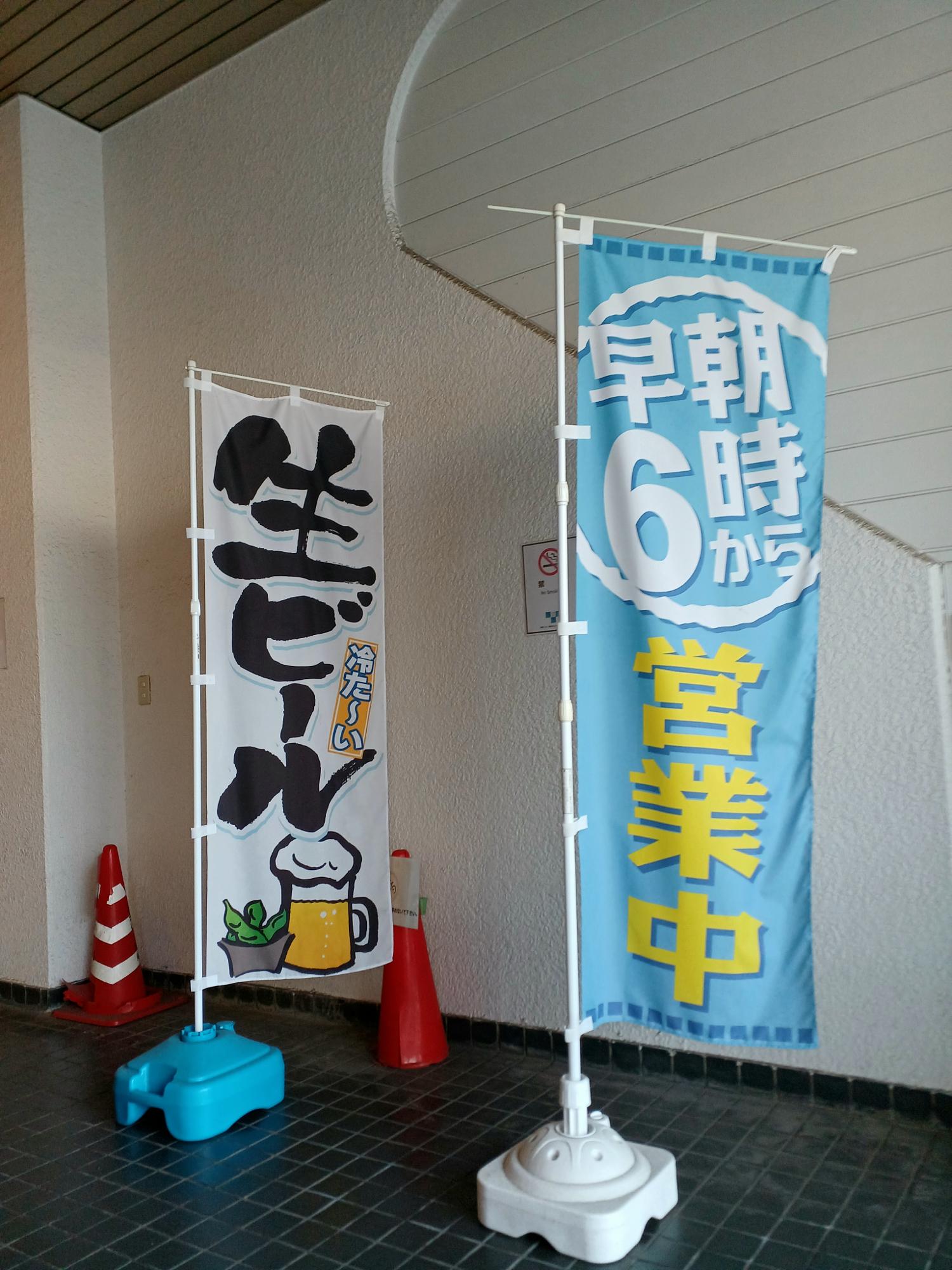 早朝営業と生ビールの幟が。