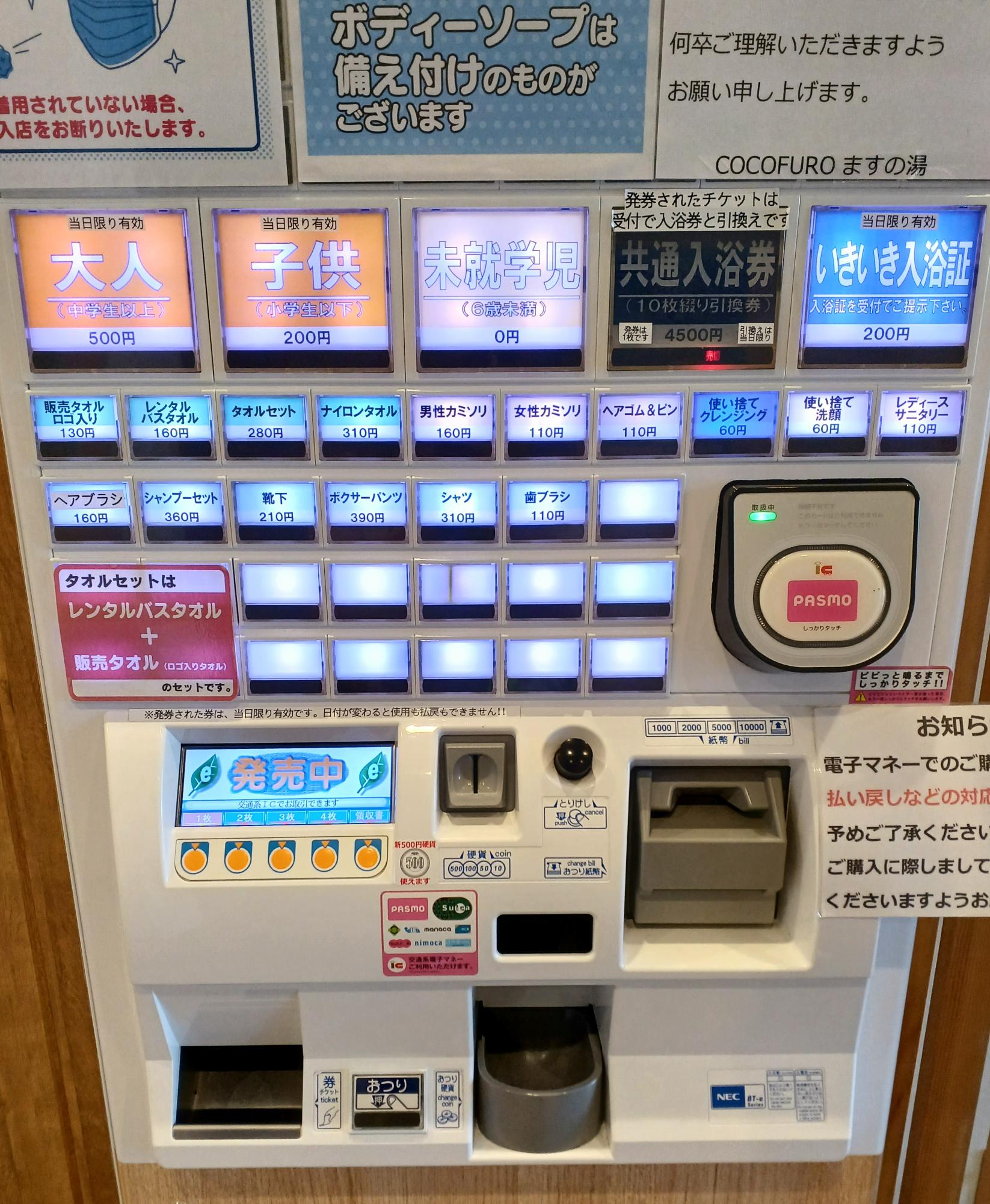 券売機で入浴券を購入。都内共通入浴券も利用可能です。