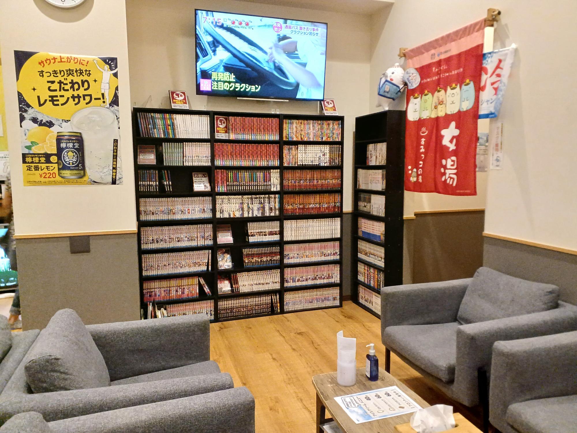 休憩所には一人掛けソファーが並びます。漫画コーナーも充実。