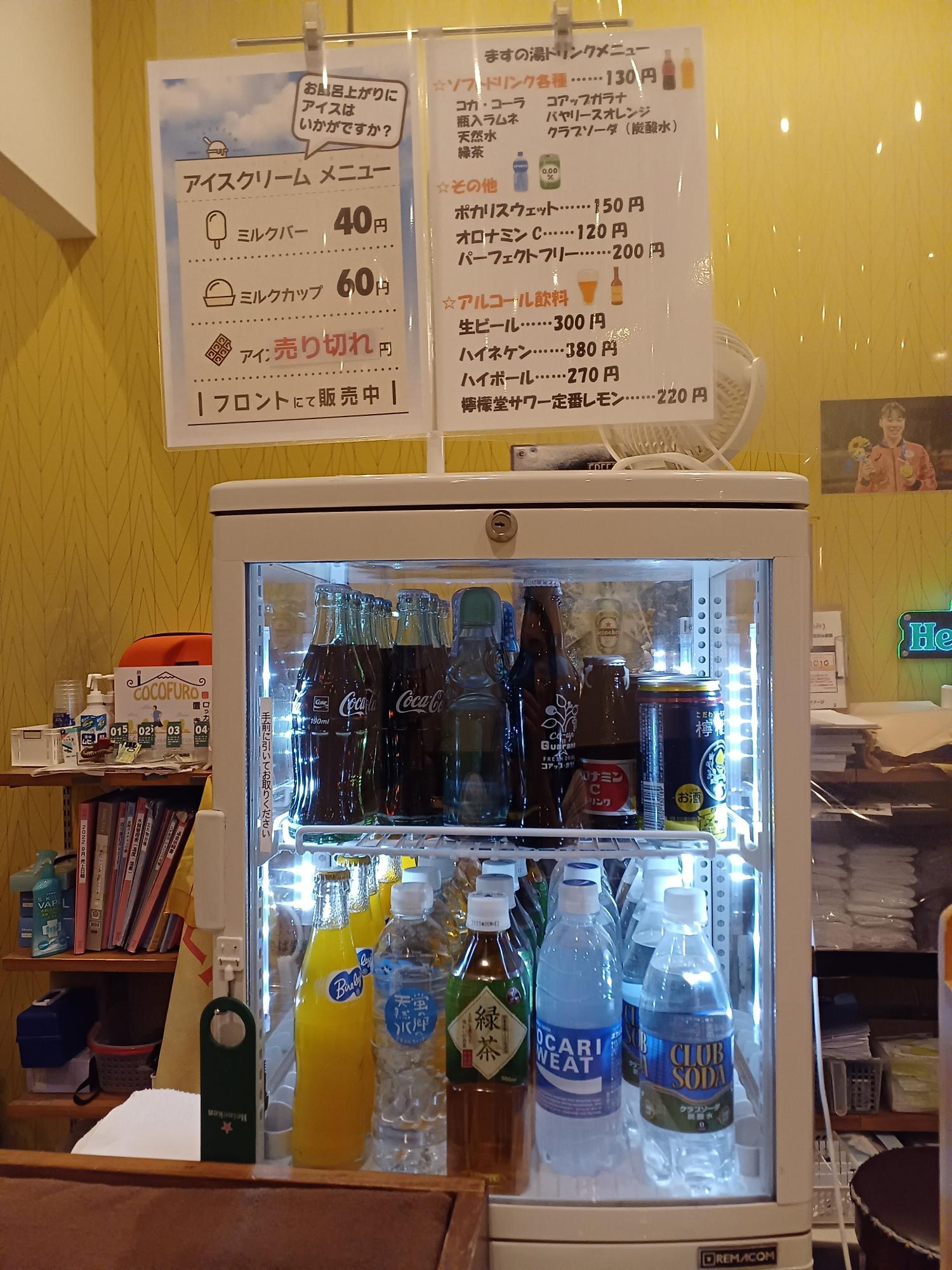 浴室内は、かけ流しの黒湯風呂があり、水風呂も源泉そのままの黒湯です。入浴料のみでドライサウナも利用可能!そしてサウナの中には、ビールとアイスのチラシが貼られていました…どちらも買わずにいられる人は、果たしているのか。