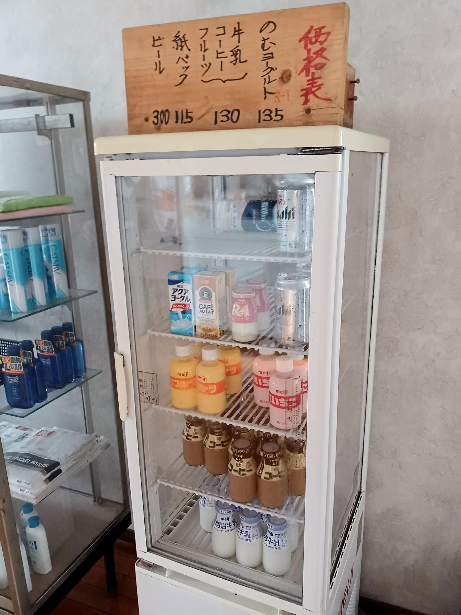 缶ビールやフルーツ牛乳も。木に書かれた価格表がいい味を出しています。