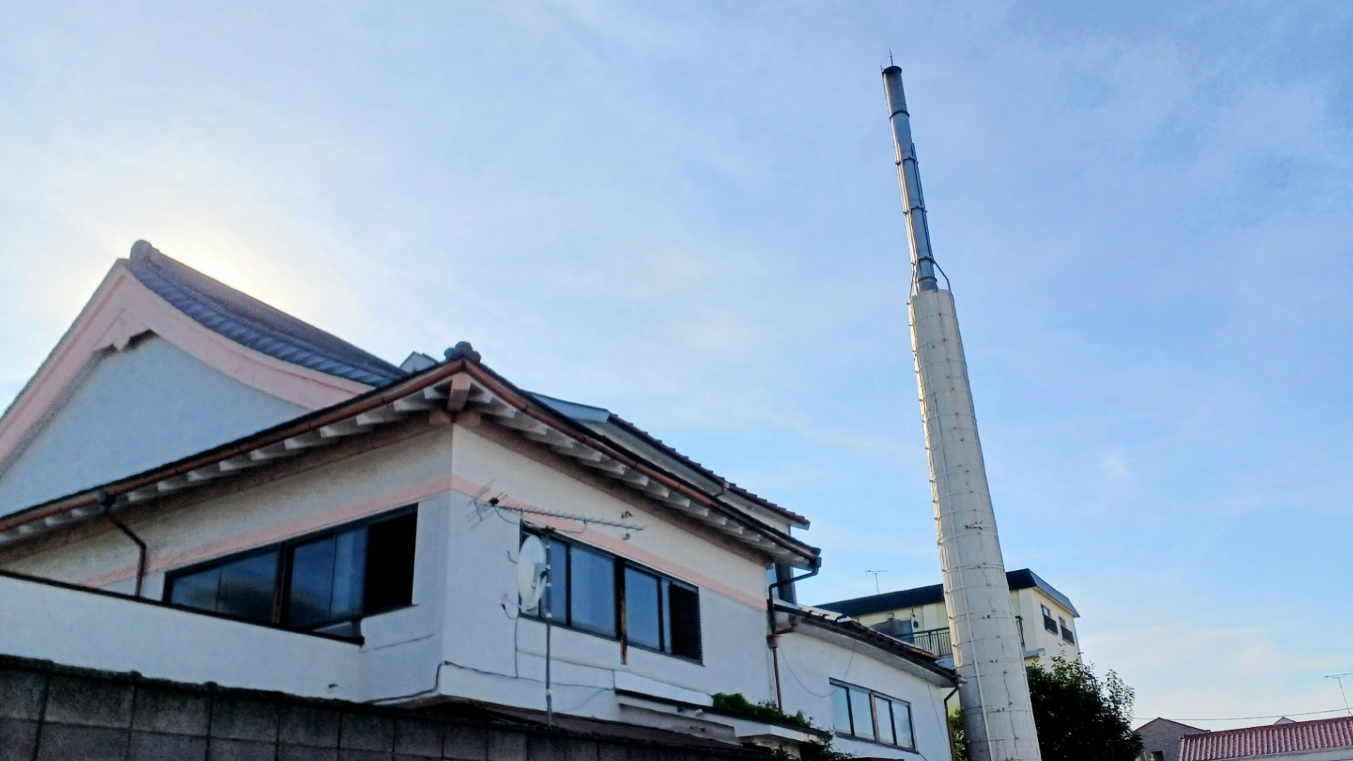 東急多摩川線・下丸子駅から徒歩3分、「都湯」。線路側からは、天高くそびえる煙突が目印です。建物は、心落ち着くこのデザイン。