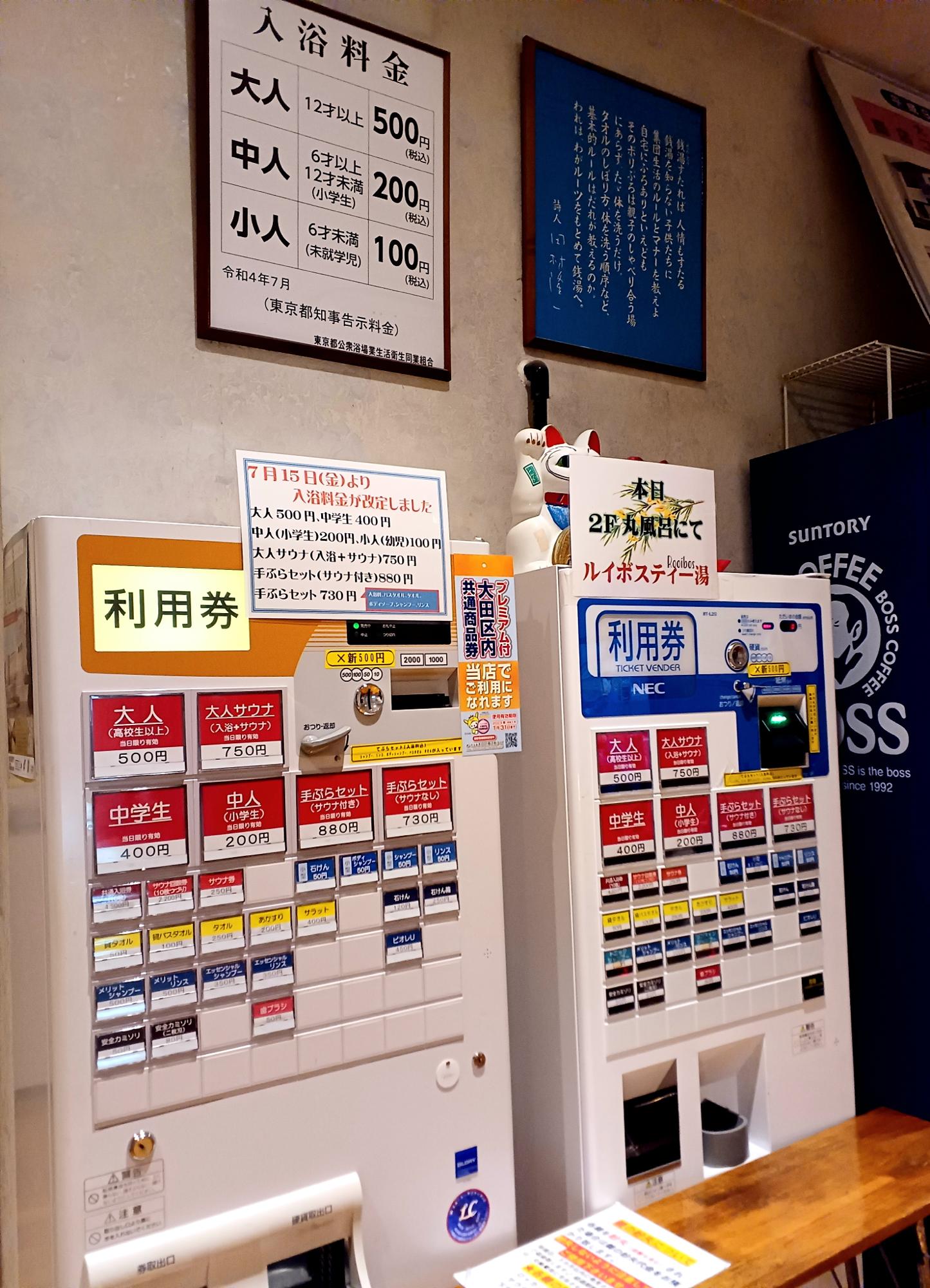 入って左手に券売機。2022年12月現在、大人料金は500円。いくつか銭湯を巡るなら、10枚綴りで4,500円の「都内共通入浴券」は手に入れておきたいところ。