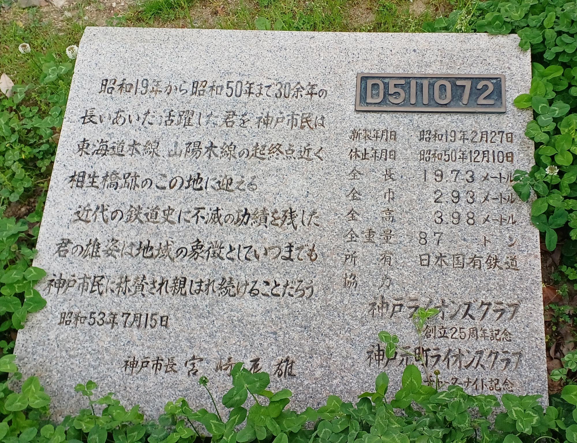 JR神戸線(東海道線・山陽本線)の高架そばで、現在は「D51広場」として整備されている。記念碑には、「近代の鉄道史に不滅の功績を残した君の雄姿は地域の象徴としていつまでも神戸市民に称賛され親しまれ続けることだろう」とある。