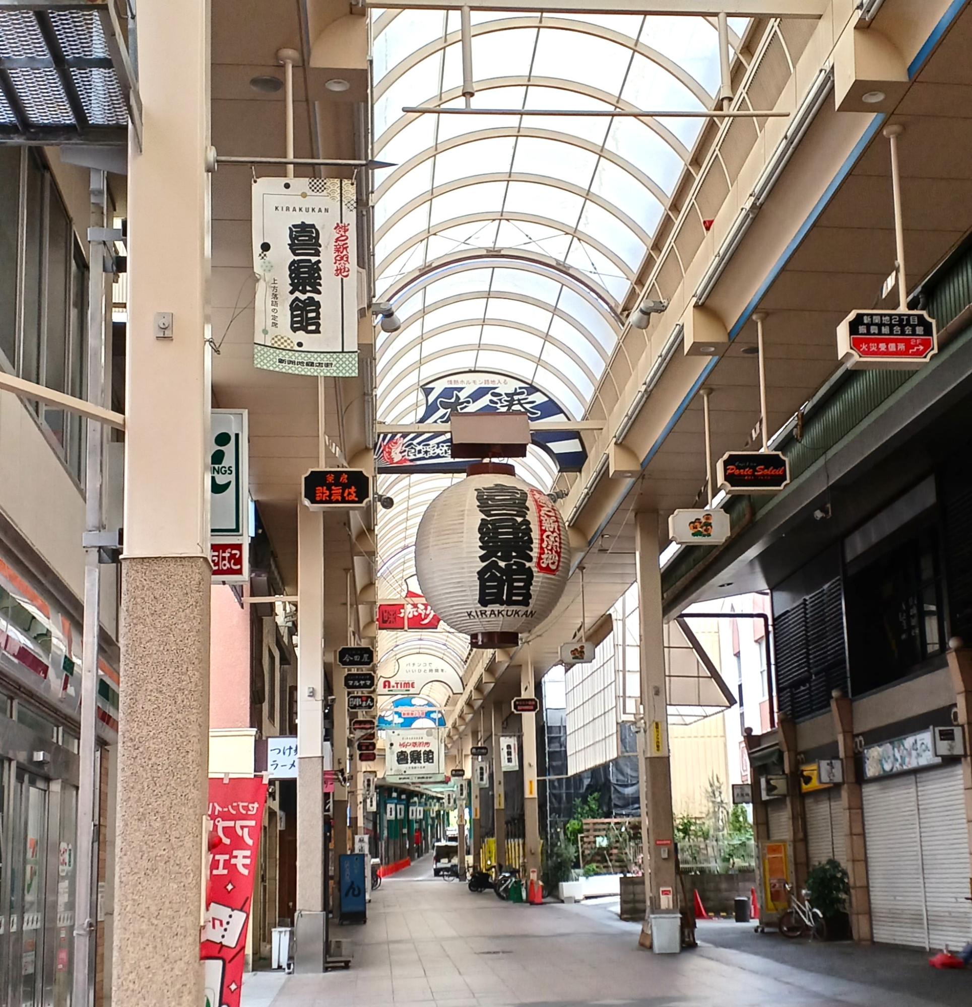新開地商店街はアーケード街になっている。2018年にオープンした寄席「喜楽館」は上方落語の定席。GW中の特別公演は、すでにチケット完売の公演も多い。