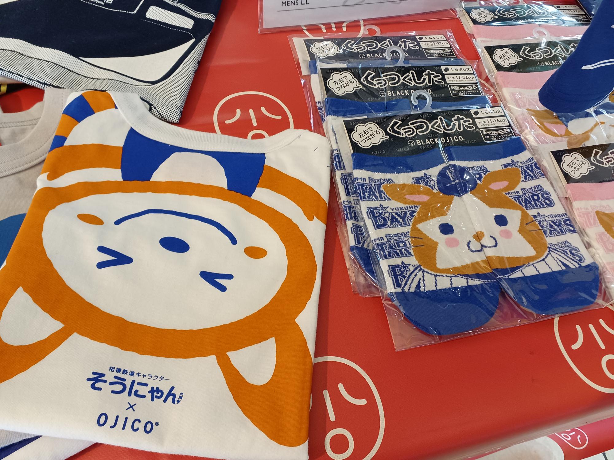 …と、こんなことを考えていたら、2マスコットが並んでいるのに出会った!横浜駅・相鉄ジョイナスの一階通路、Tシャツショップ「OJICO」のポップアップストアで、そうにゃんのTシャツとスターマンの靴下が隣り合っている。こちらのポップアップストアは4月16日まで。
