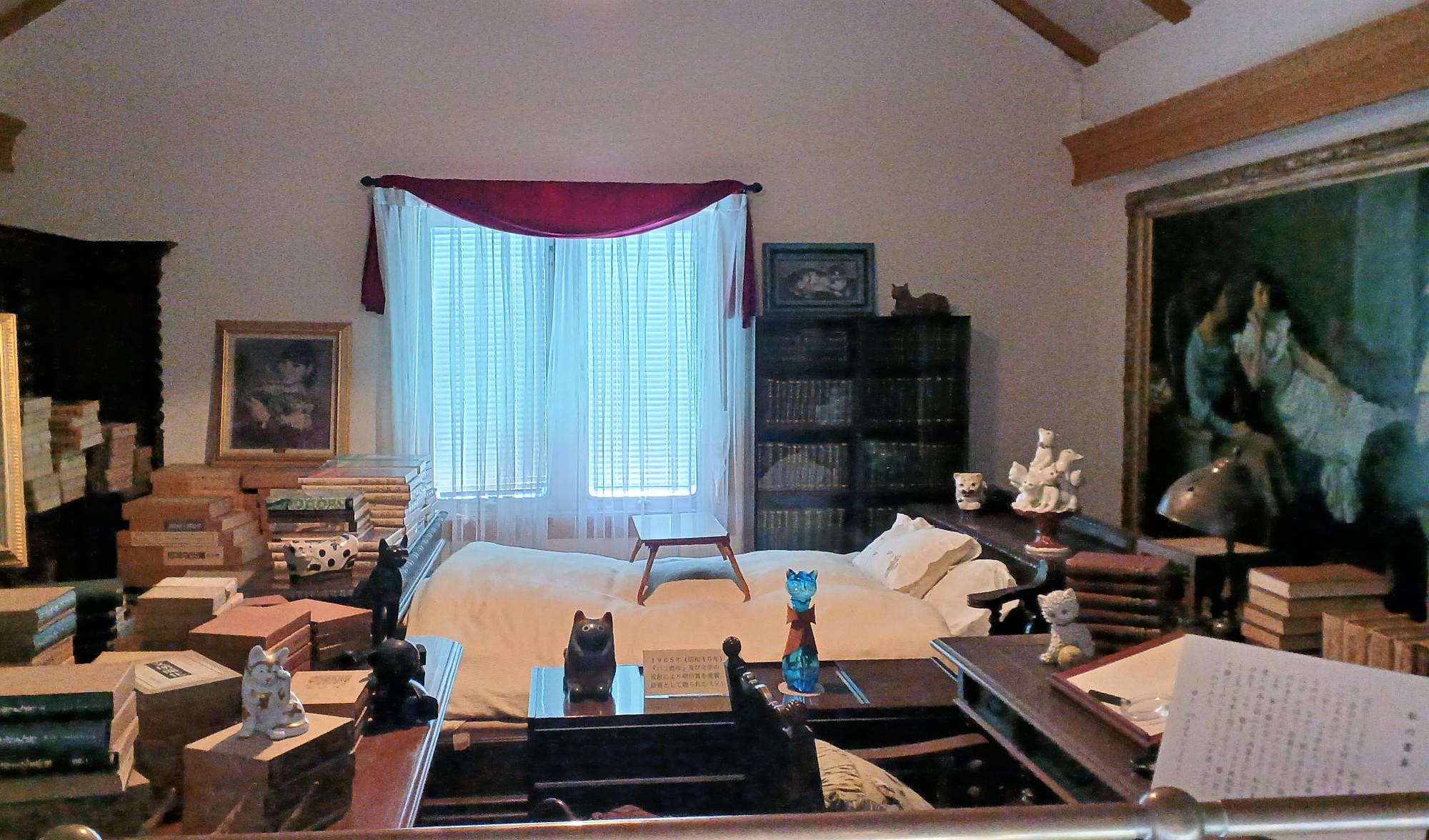 記念館には、寝室と書斎を再現した部屋がある。ベッドは大佛が特注で作らせたもので、ヘッドボードと足元に本を置くスペースが。晩年は幕末・維新史に関心を持ち、「天皇の世紀」の執筆を続けた。資料が積み上げられている。