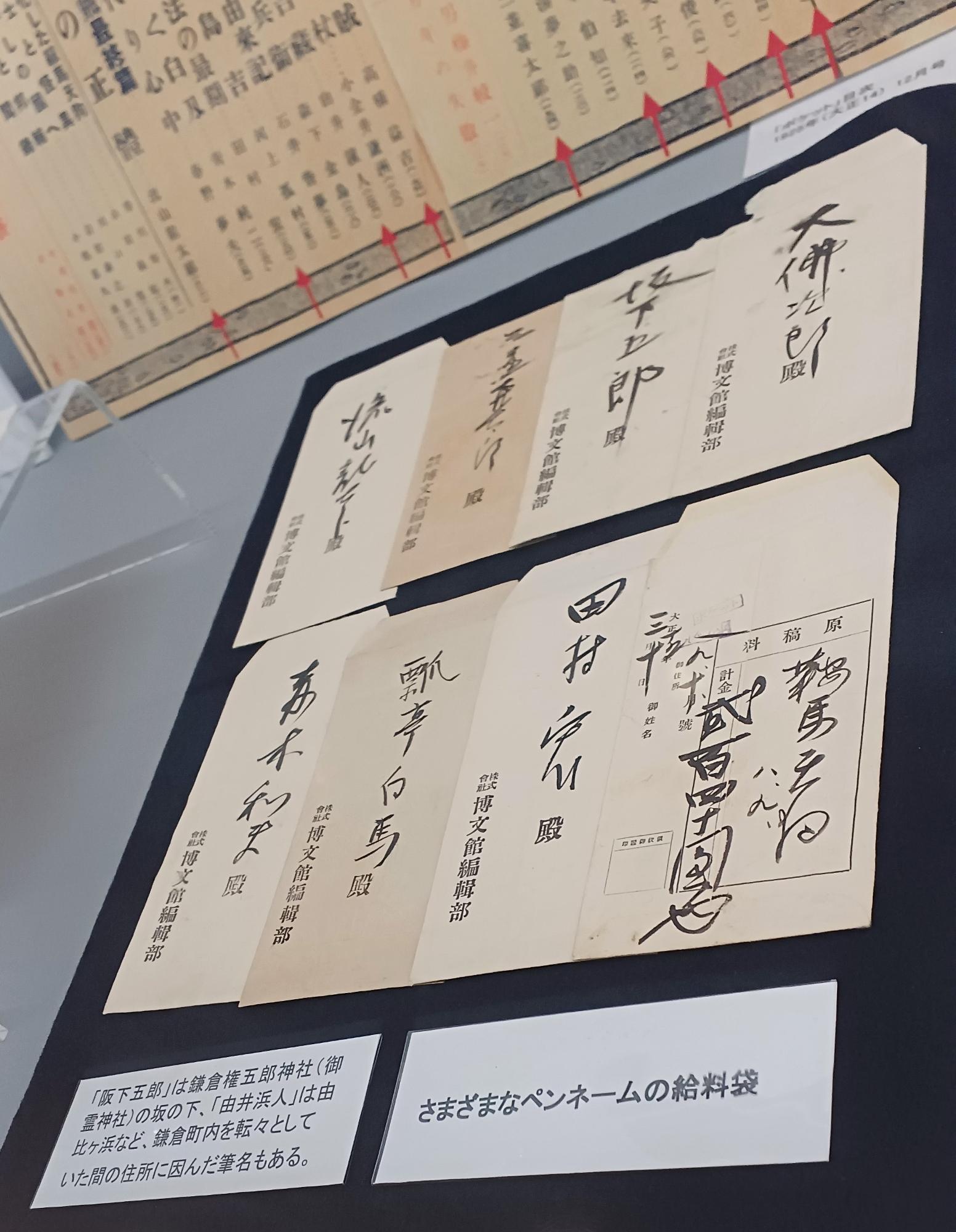 出版社の博文館からもらった給料袋には、大佛次郎のほかに「坂下五郎」「田村宏」「瓢亭白馬」などの名前が。様々なペンネームを使い分けていた。
