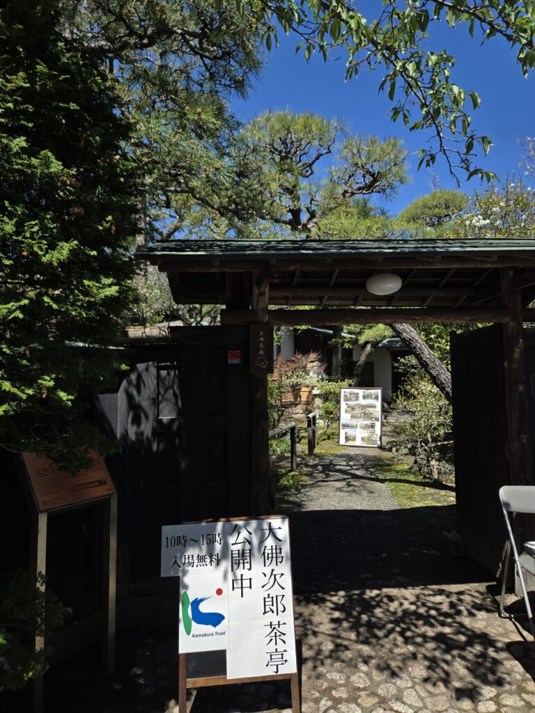 大正8(1919)年に建てられたという、茅葺き屋根の平屋建て。「旧大佛次郎茶亭」ホームページによれば、一時は存続の危機があったものの、2023年の改修を経て現在の姿が保たれているという。