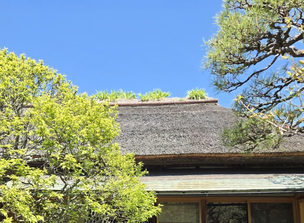 よく見ると、屋根の上にも植物が生えている。改修時、屋根の葺替えで「芝棟」にし、イチハツ(アヤメ科)の球根を植えたのだという。