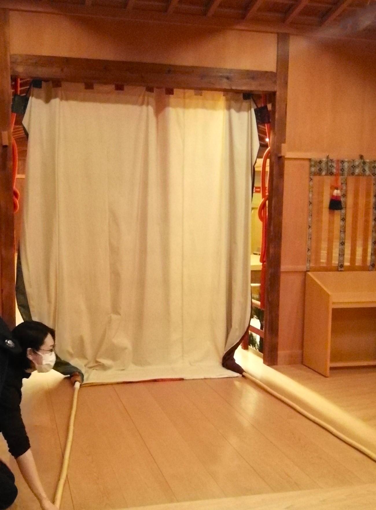 見学ツアーでは楽屋なども紹介。能・狂言で役者が登場する揚幕(あげまく)を、裏側から。