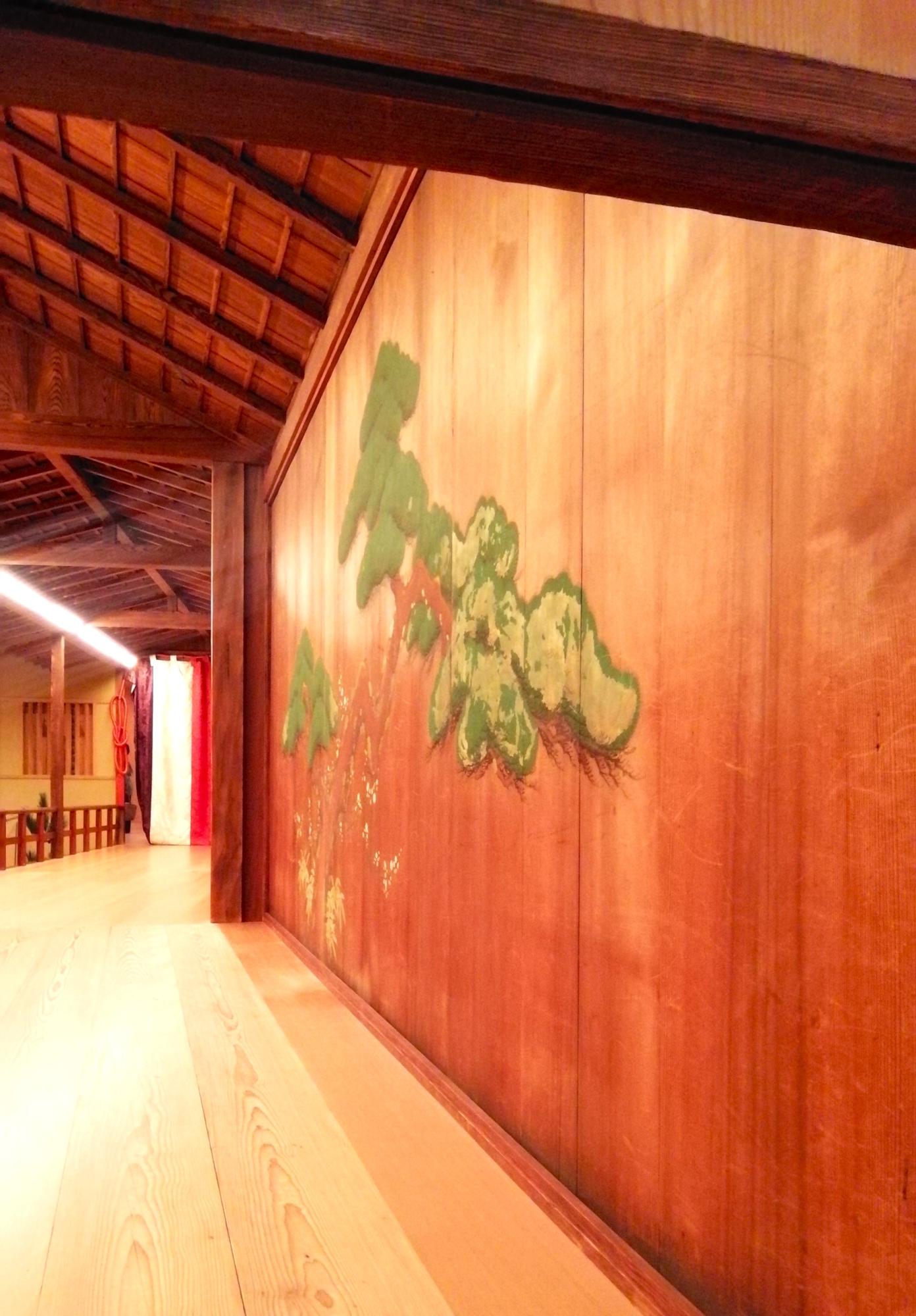 横浜能楽堂の鏡板には、梅が描かれている。普段は舞台の後ろに見える背景画も、施設見学で間近に見ることができる。