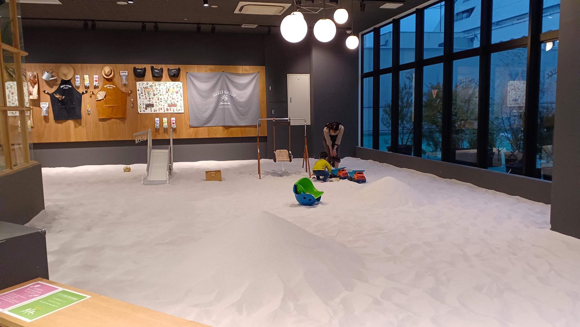 30分500円から遊べるキッズプレイグラウンドで、砂場の中にはすべり台やブランコもある。子供たちが30人以上入ることのできる広さだ。