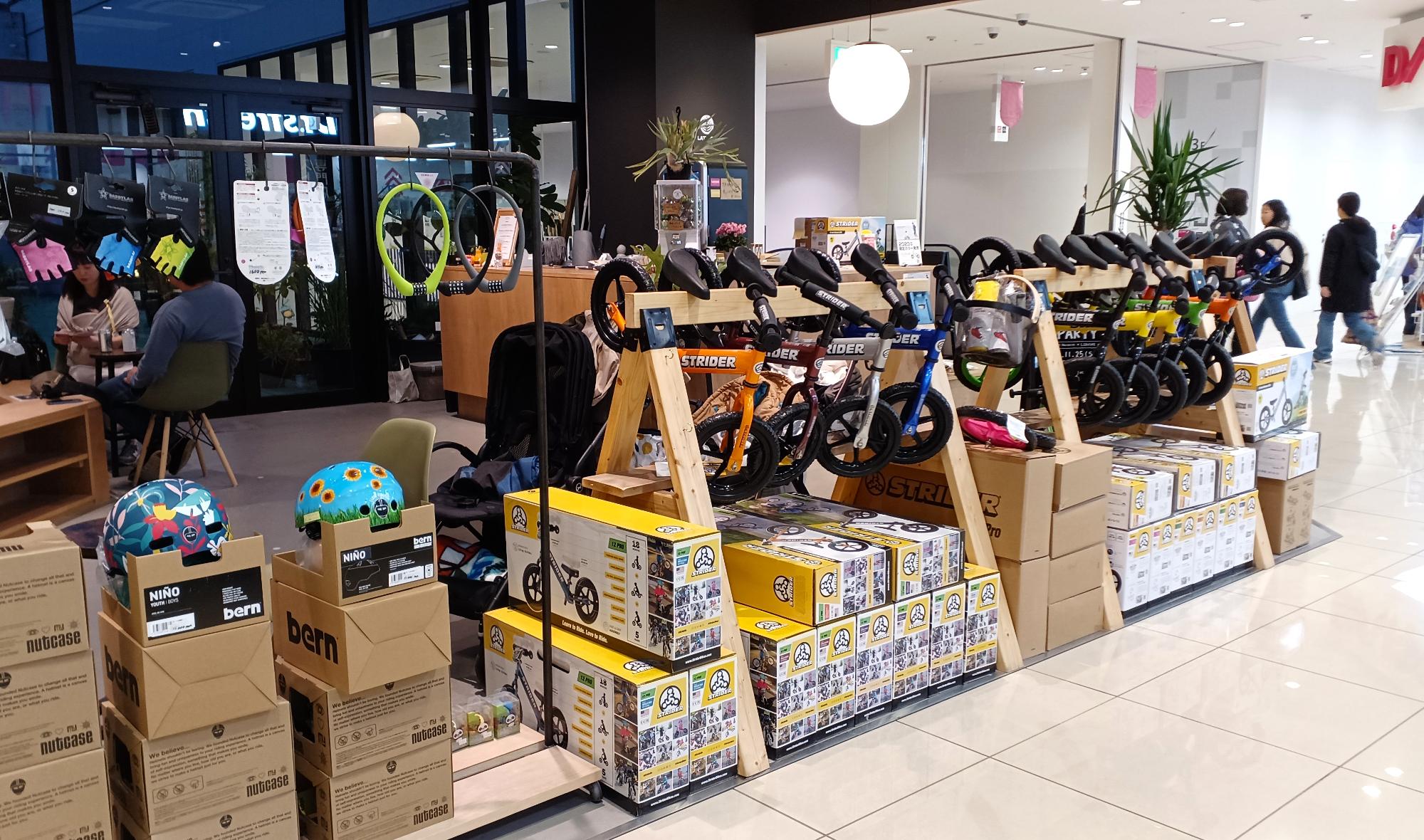 子供向けの自転車「STRIDER(ストライダー)」やヘルメットも販売。試乗も可能。