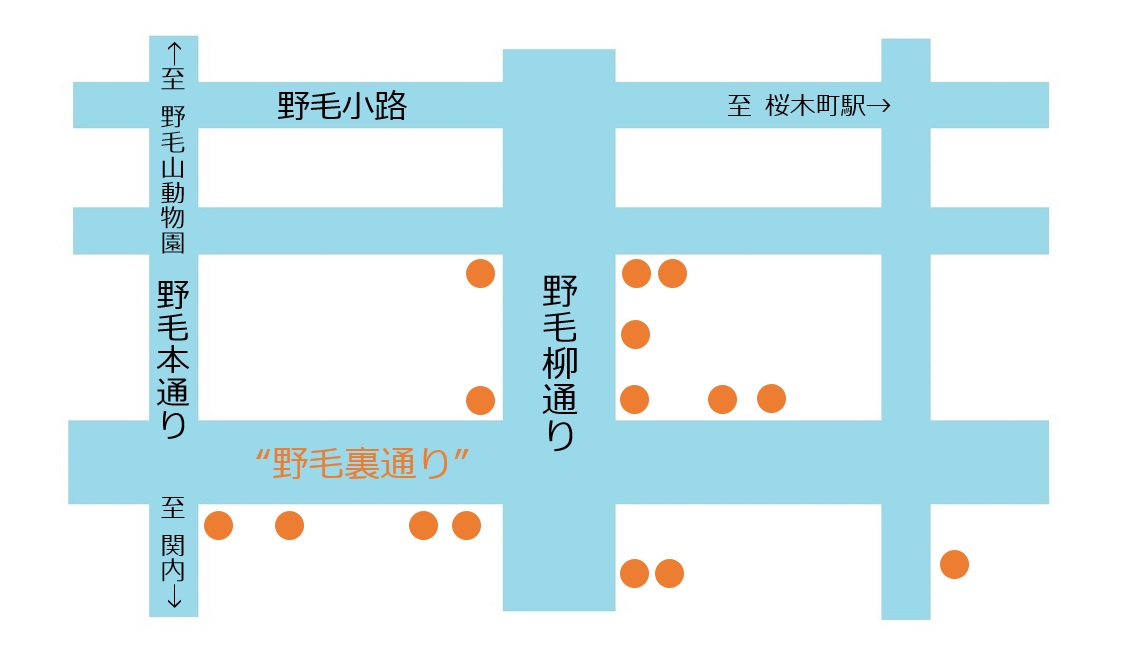 桜木町・日ノ出町方面からは野毛柳通りを入って大岡川に向かって進む。関内方面からは都橋を渡って、二番目の通りを右へ。野毛の中では東側(野毛町一丁目)にあたるエリア。「野毛柳通り」「野毛小路」といった有名な通りに対して、「野毛の裏通り」も盛り上げようというイベントだ。