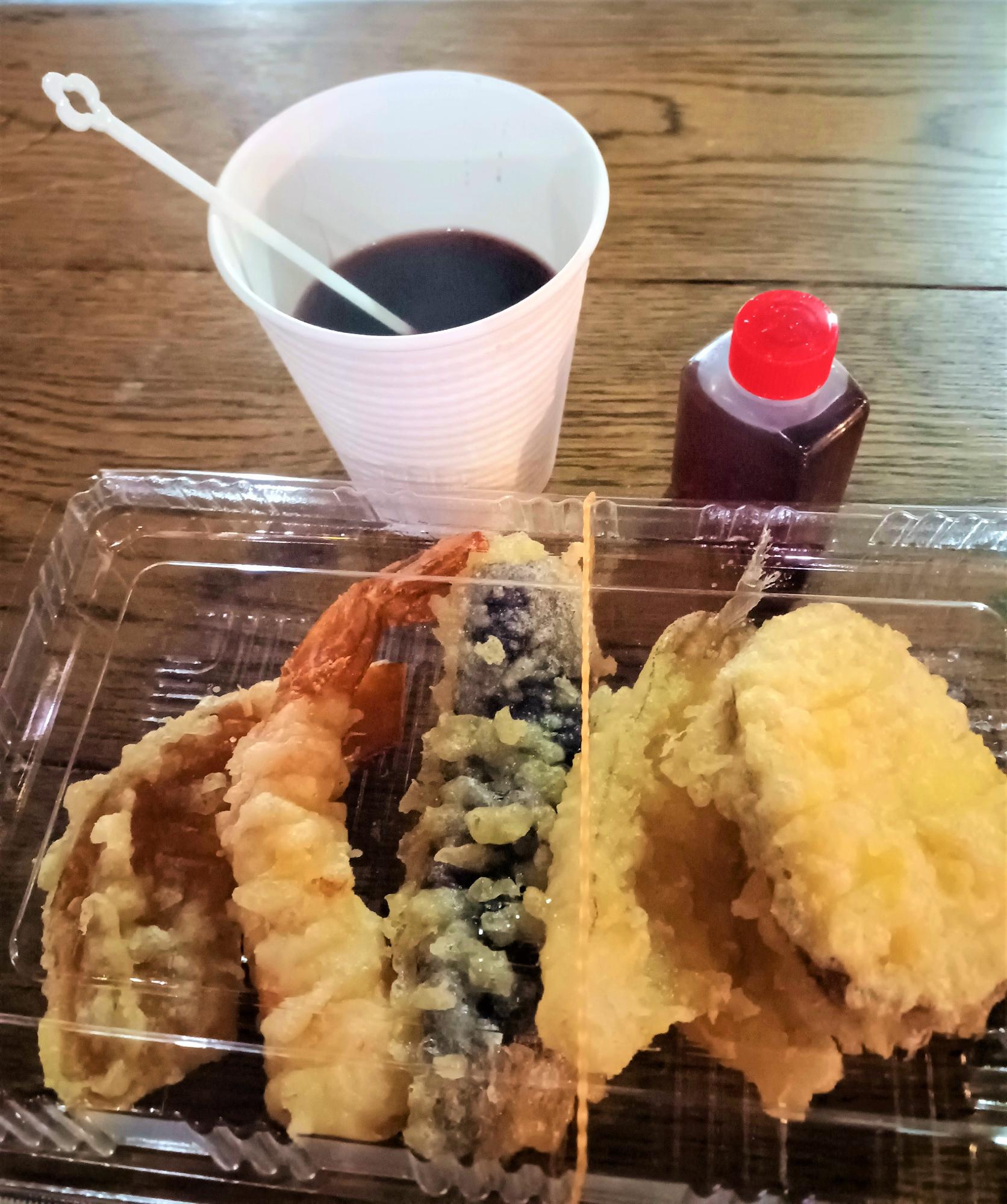 欲しいものを買った結果、ホットワインと天ぷらという、珍しい組み合わせに。ホットワインはスパイスが効いていて温まる!天ぷらは、ボリュームある具材とカリカリとした衣でおいしい!
