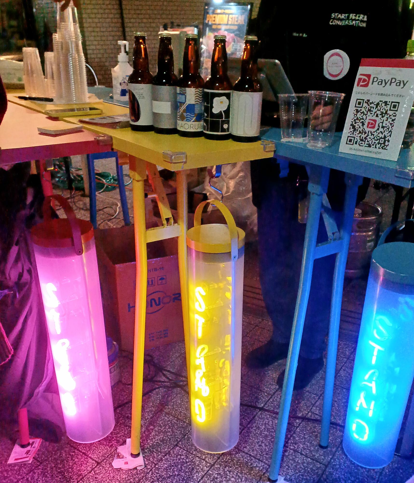 JR蒲田駅と京急蒲田駅の間にある、さかさ川通り。こちらは4日(金)夜の様子、飲食スペースのテーブルも用意されています。