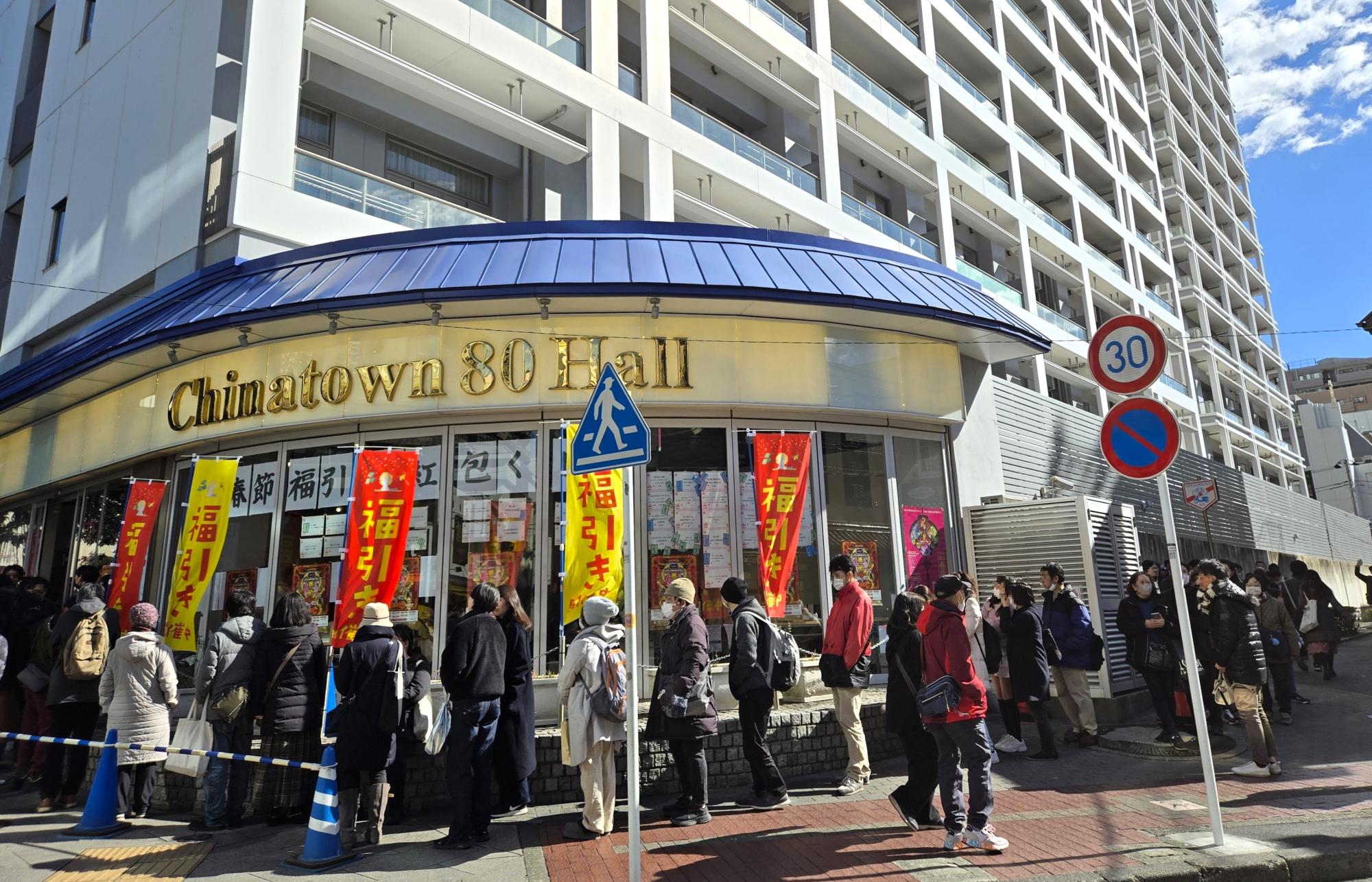 「福引き」の幟に列をなす人々。週末ともなると、30分超となる待ち時間の日も。横浜中華街では、春節福引きの「紅包(ほんぱお)くじ」が今年も人気を集めている。くじがもらえる「横浜春節祭デジタルスタンプラリー」についてはこちらの記事も。